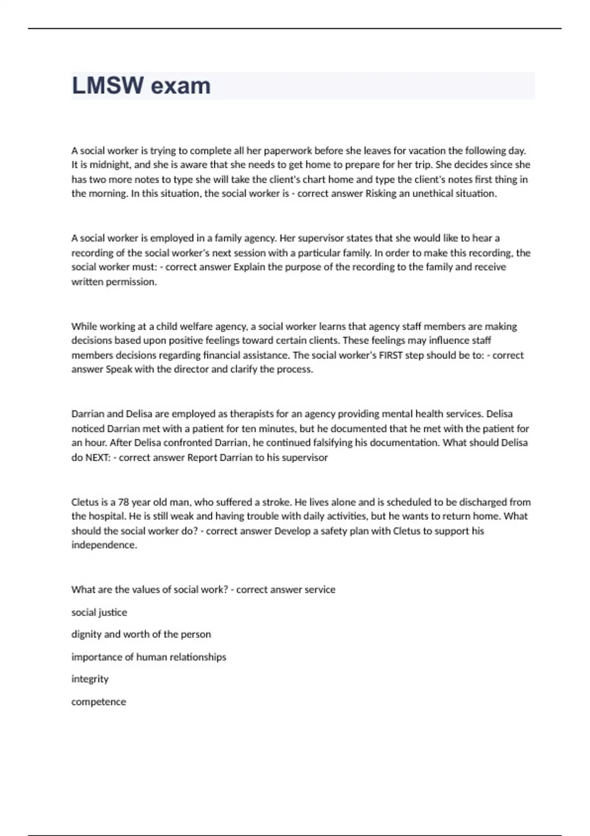LMSW Questions And Answers 2024. A social worker is trying to complete all her paperwork before she leaves for vacation the following day. It is midnight, and she is aware that she needs to get home to prepare for her trip. She decides since she has two more notes to type she will take the client's chart home and type the client's notes first thing in the morning. In this situation, the social worker is - correct answer Risking an unethical situation. A social worker is employed in a family agency. Her supervisor states that she would like to hear a recording of the social worker's next session with a particular family. In order to make this recording, the social worker must: - correct answer Explain the purpose of the recording to the family and receive written permission.