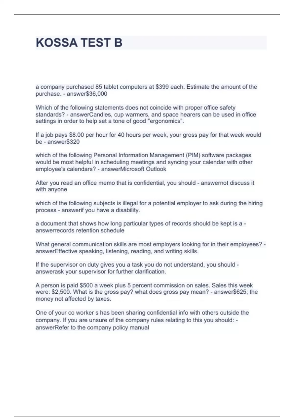KOSSA TEST B QUESTIONS AND ANSWERS 2024