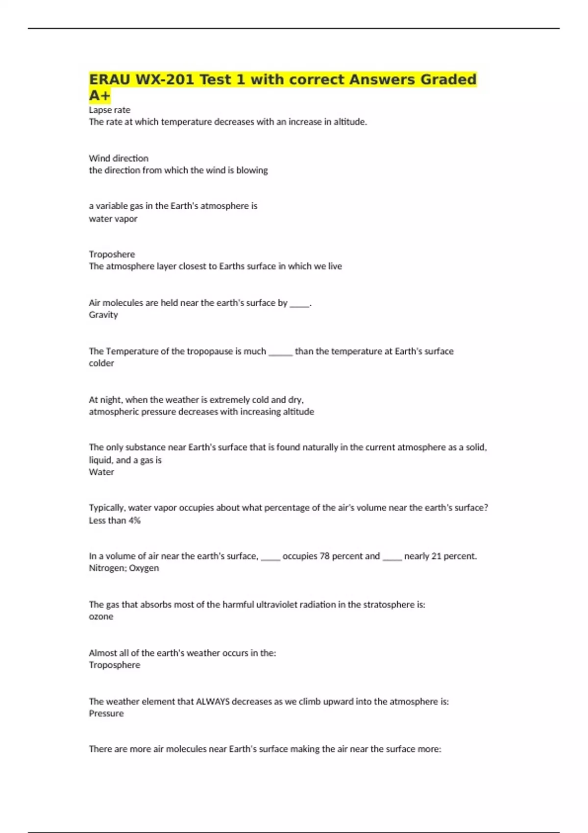 The weather element that ALWAYS decreases as we climb upward into the atmosphere is: