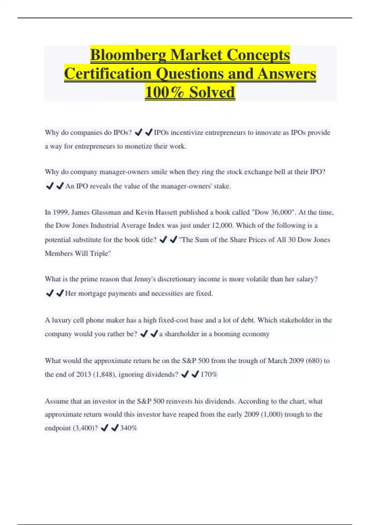 Bloomberg Market Concepts Certification Questions and Answers 100% Solved Why do companies do IPOs? ️️IPOs incentivize entrepreneurs to innovate as IPOs provide a way for entrepreneurs to monetize their work. Why do company manager-owners smile when they ring the stock exchange bell at their IPO? ️️An IPO reveals the value of the manager-owners' stake. In 1999, James Glassman and Kevin Hassett published a book called "Dow 36,000". At the time, the Dow Jones Industrial Average Index was just under 12,000. Which of the following is a potential substitute for the book title? ️️"The Sum of the Share Prices of All 30 Dow Jones Members Will Triple" What is the prime reason that Jenny's discretionary income is more volatile than her salary? ️️Her mortgage payments and necessities are fixed.