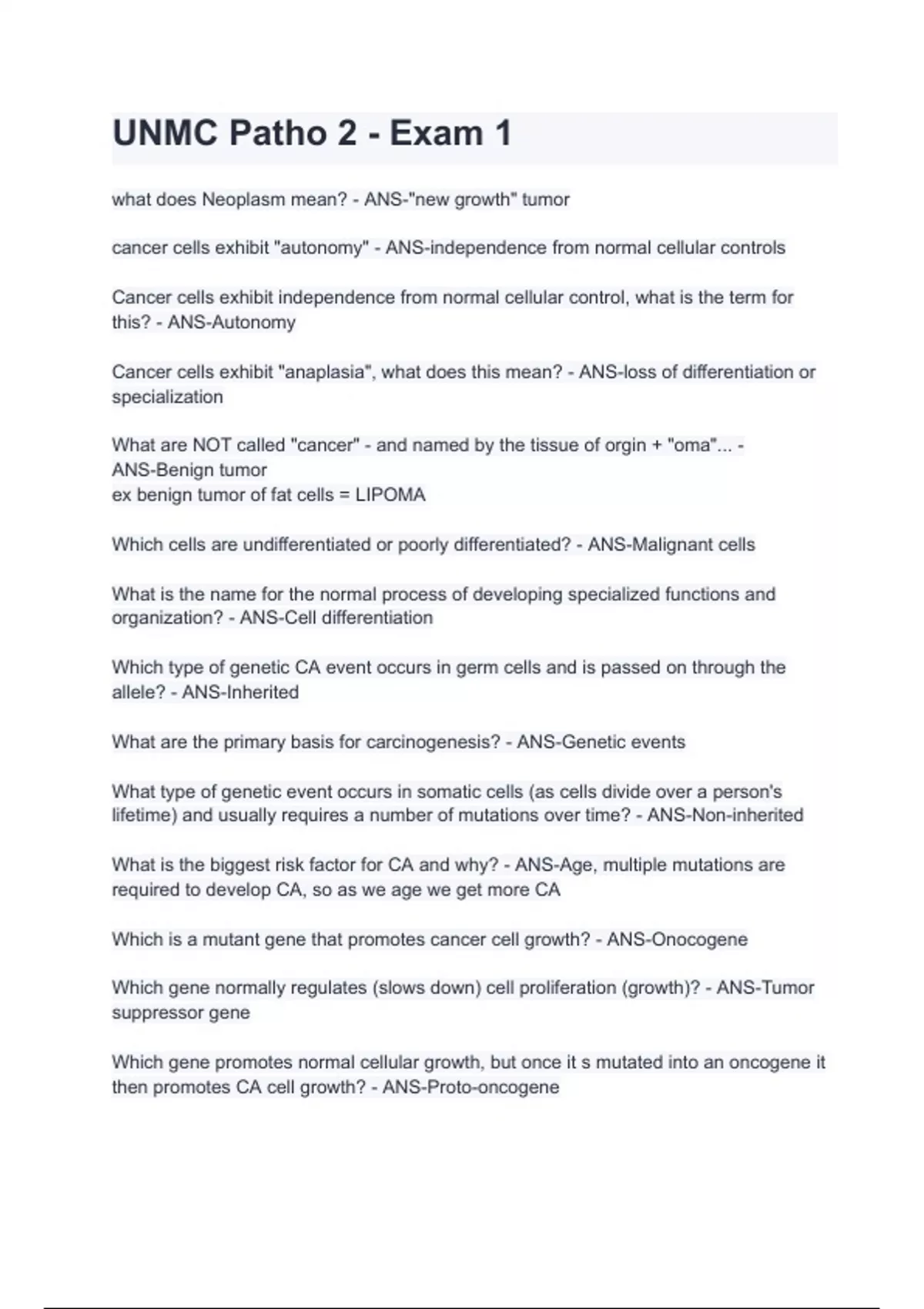 UNMC Patho 2 - Exam 1 with 100% correct answers