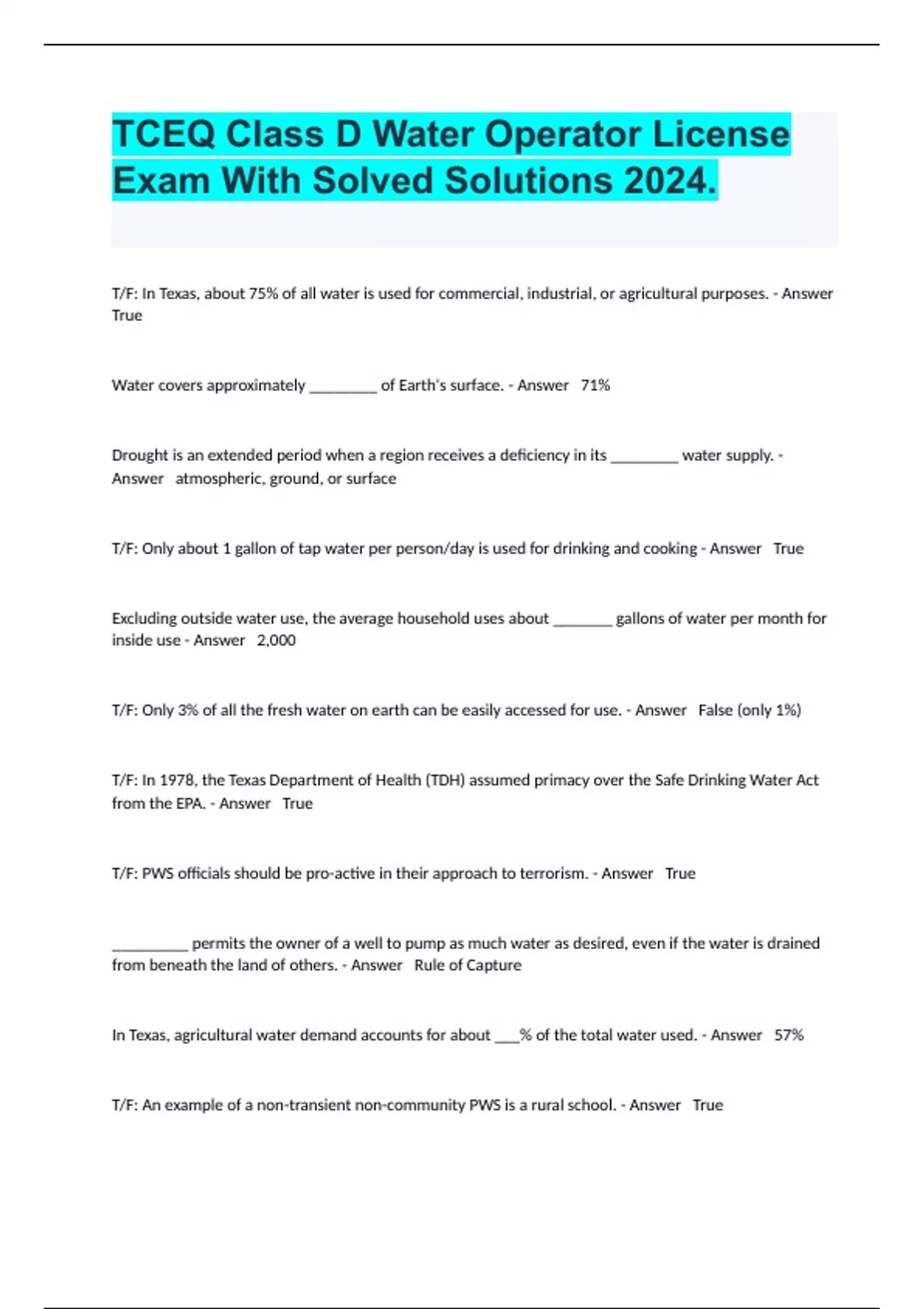 T/F: In Texas, about 75% of all water is used for commercial, industrial, or agricultural purposes. - Answer