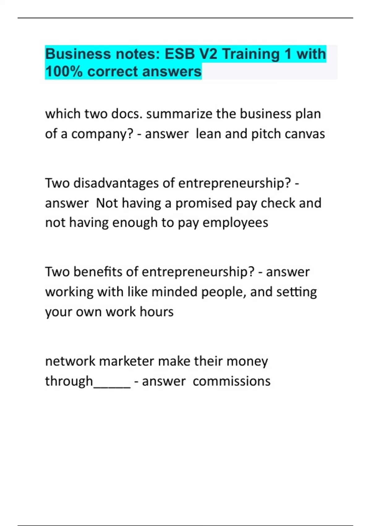 Business notes: ESB V2 Training 1 with 100% correct answers