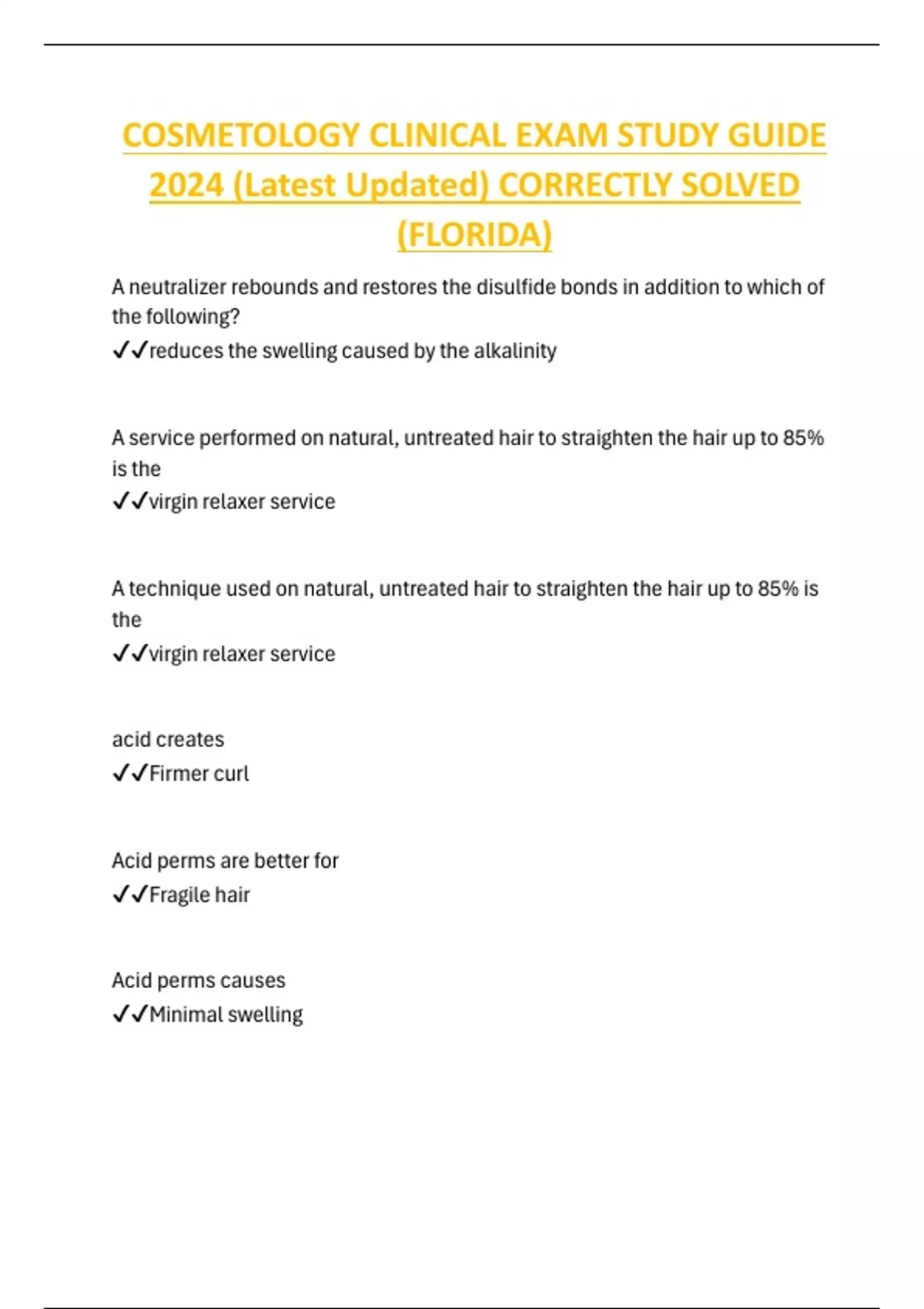 COSMETOLOGY CLINICAL EXAM STUDY GUIDE 2024 (Latest Updated) CORRECTLY SOLVED (FLORIDA)