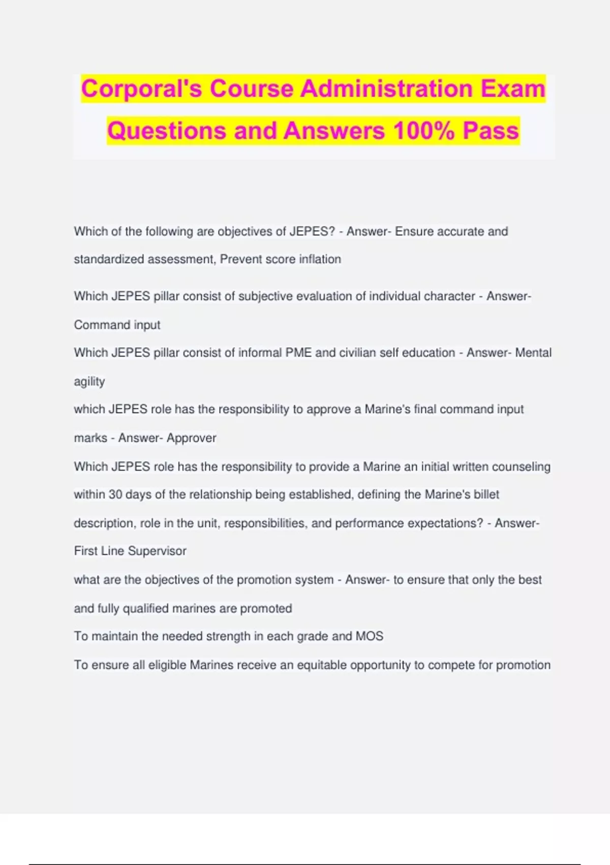 Corporal's Course Administration Exam Questions and Answers 100% Pass Which of the following are objectives of JEPES? - Answer- Ensure accurate and standardized assessment, Prevent score inflation Which JEPES pillar consist of subjective evaluation of individual character - Answer- Command input Which JEPES pillar consist of informal PME and civilian self education - Answer- Mental agility which JEPES role has the responsibility to approve a Marine's final command input marks - Answer- Approver Which JEPES role has the responsibility to provide a Marine an initial written counseling within 30 days of the relationship being established, defining the Marine's billet description, role in the unit, responsibilities, and performance expectations? - Answer- First Line Supervisor what are the objectives of the promotion system - Answer- to ensure that only the best and fully qualified marines are promoted To maintain the needed strength in each grade and MOS To ensure all eligible Marines receive an equitable opportunity to compete for promotion Promotion to which of the following ranks requires a Marine to have a Performance Evaluation System (PES) score that meets or exceeds the cutting score for their MOS? Select all that apply - Answer- Cpl Sgt What is the PME requirement for promotion to corporal? - Answer- Lance Corporal Leadership and Ethics Seminar Promotion to which of the following ranks does not require a Marine to have a Performance Evaluation System (PES) score? - Answer- PFC LCPL