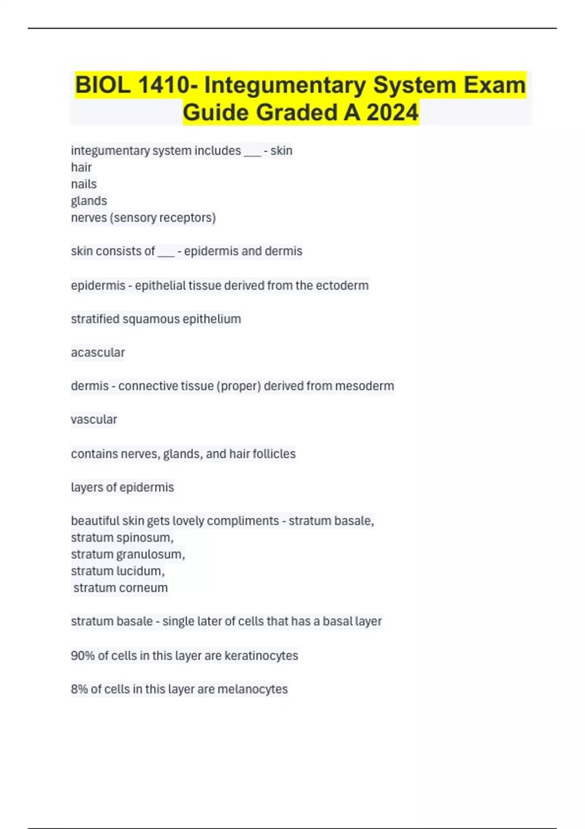 BIOL 1410- Integumentary System Exam Guide Graded A 2024
