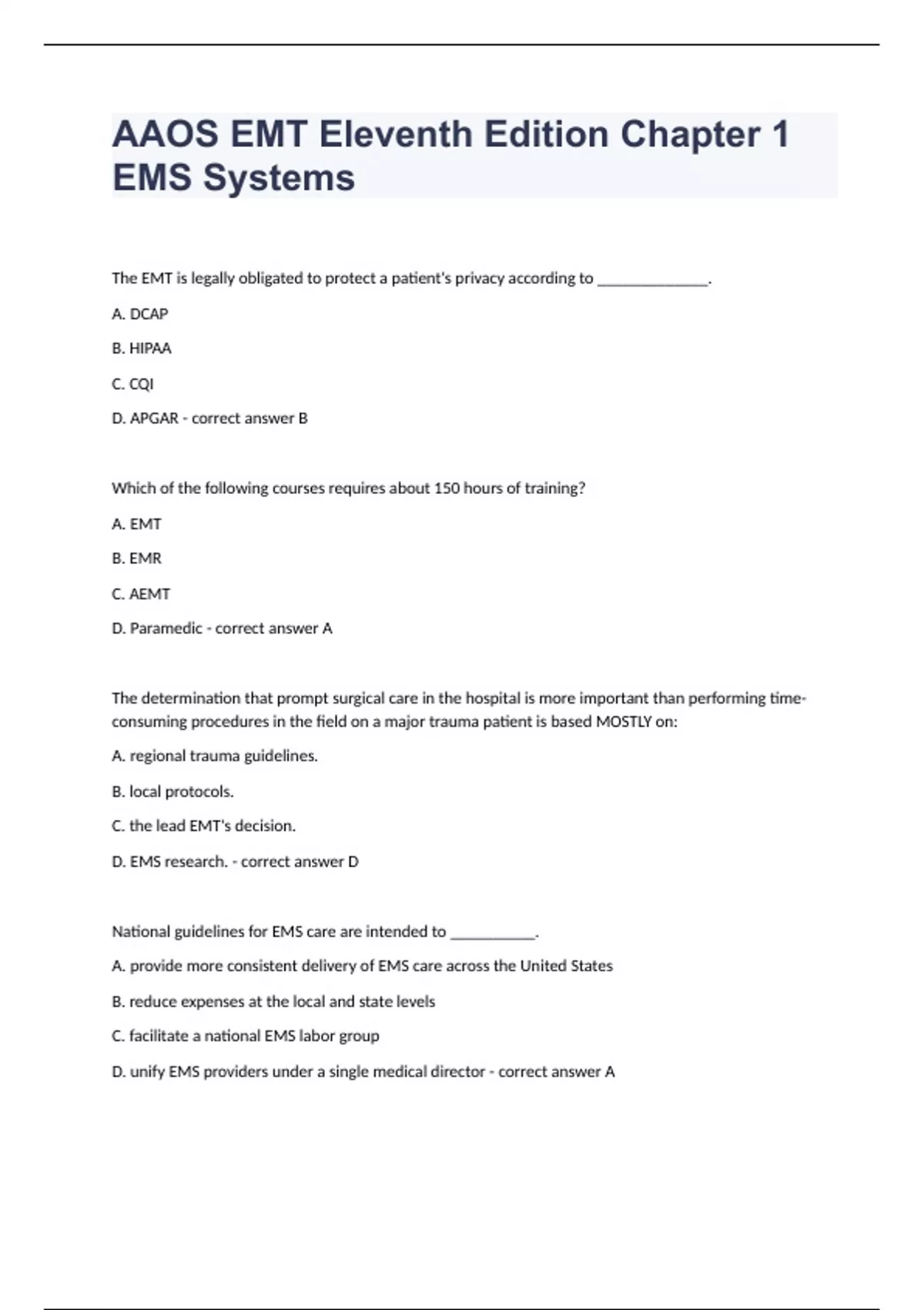 AAOS EMT Eleventh Edition Chapter 1 EMS Systems Question and answers rated A+ AAOS EMT Eleventh Edition Chapter 1 EMS Systems The EMT is legally obligated to protect a patient's privacy according to _____________. A. DCAP B. HIPAA C. CQI D. APGAR - correct answer B Which of the following courses requires about 150 hours of training? A. EMT B. EMR C. AEMT D. Paramedic - correct answer A The determination that prompt surgical care in the hospital is more important than performing time-consuming procedures in the field on a major trauma patient is based MOSTLY on: A. regional trauma guidelines. B. local protocols. C. the lead EMT's decision. D. EMS research. - correct answer D National guidelines for EMS care are intended to __________. A. provide more
