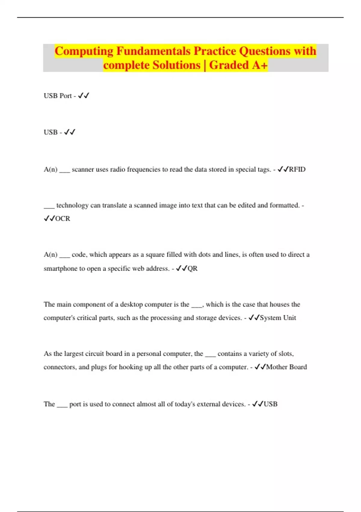 Computing Fundamentals Practice Questions with complete Solutions | Graded A+