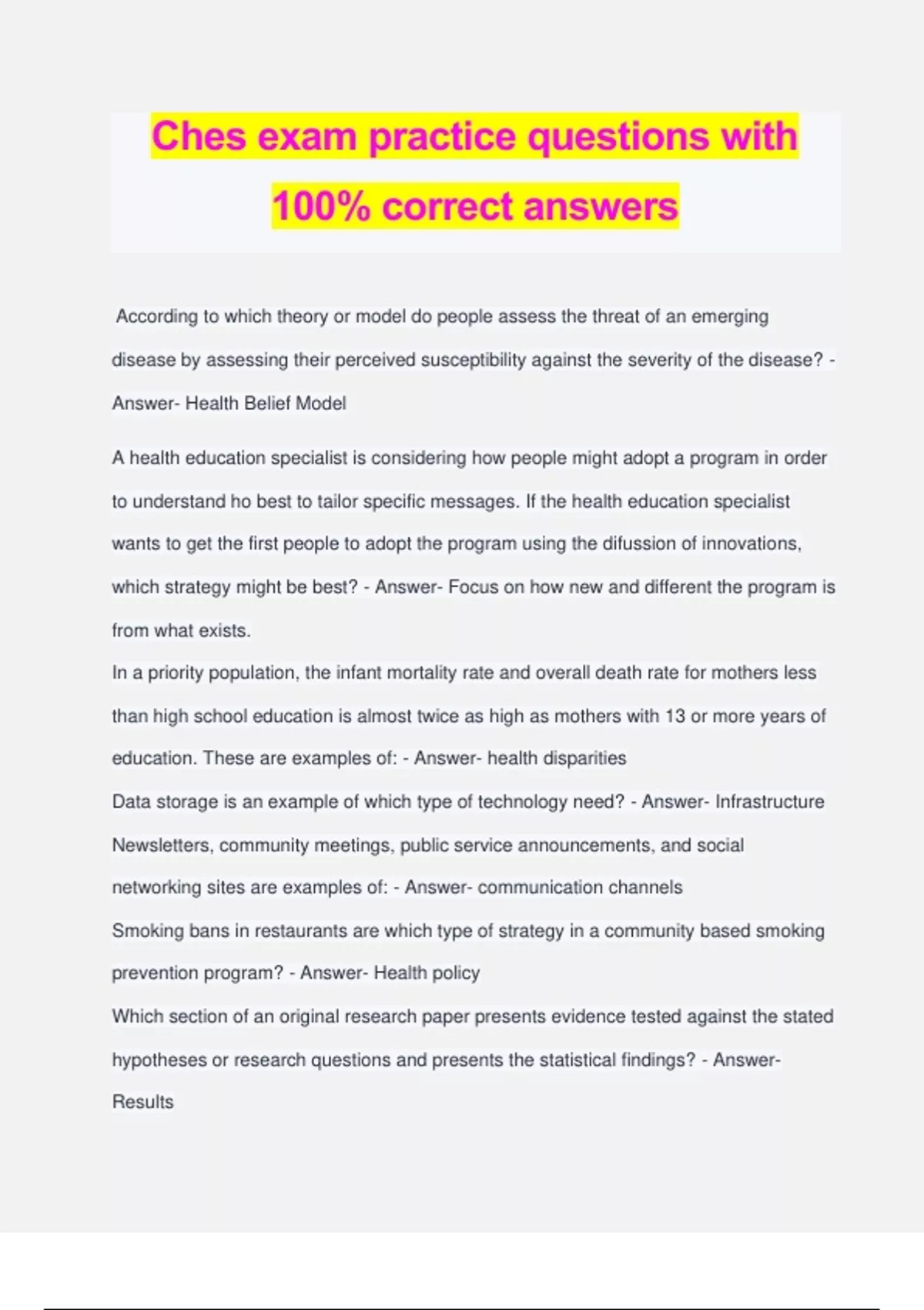 Ches exam practice questions with 100% correct answers According to which theory or model do people assess the threat of an emerging disease by assessing their perceived susceptibility against the severity of the disease? - Answer- Health Belief Model A health education specialist is considering how people might adopt a program in order to understand ho best to tailor specific messages. If the health education specialist wants to get the first people to adopt the program using the difussion of innovations, which strategy might be best? - Answer- Focus on how new and different the program is from what exists. In a priority population, the infant mortality rate and overall death rate for mothers less than high school education is almost twice as high as mothers with 13 or more years of education. These are examples of: - Answer- health disparities Data storage is an example of which type of technology need? - Answer- Infrastructure Newsletters, community meetings, public service announcements, and social networking sites are examples of: - Answer- communication channels Smoking bans in restaurants are which type of strategy in a community based smoking prevention program? - Answer- Health policy Which section of an original research paper presents evidence tested against the stated hypotheses or research questions and presents the statistical findings? - Answer- Results which of the following statements about informed consent is correct? - Answer- It explains the benefits, risks, and participation is voluntary and may be terminated at any time. The health department administrator just returned from a meeting where someone used a focus group to gather data and now has a great idea. The adminstrator tasks the health education specialist with conducting a focus group of low income citizens from the south side of town to answer questions about which heart disease intervention the department should offer city wide. Knowing the limitation of this strategy, the health education specialist is rightfully concerned about: - Answer- the generalizability of the findings When developing advocacy plans, which questions would be considered last? - Answer- What tactics should be used to influence the people a health education specialist is asked to find school health resources for physical activity. The most appropriate bibliographic database to search is - Answer- ERIC While hiring new employees, the health education specialist should contact the candidates professional references and validate the employees degrees. In doing so, discrepancies may be: - Answer- revealed prior to hiring The health education specialist has core substance abuse prevention coalition members in place and is currently broadening group representation. Some new members only contribute money to the coalition and are categorized as: - Answer- supporting participants A group of health education specialists run into a situation where they need to elicit specialized guidance and expert opinion on a specific health topic in order to aid in decision-making. If the following, which type of group should be consulted? - Answer- Advisory board Consumption, medication compliance, and self-care are considered which type of factors related to health? - Answer- Behavioral Health departments and work sites are implementing a new health education/promotion program to increase influenza vaccine rates for adults in a five county area. What will the project lead focus on to assess the fidelity of implementation? - Answer- Program components being implemented in the correct order When choosing a policy or issue to advocate on with a legislator, which criteria should be considered first? - Answer- How receptive the community or target population is to the proposed policy or advocacy effort The health education specialist is working with a local community to institute a smoke free environment in local businesses, agencies, and restaurants throughout the entire community. What type of health education strategy would the health education specialist implement in the community? - Answer- Ordinance A health education specialist is identifying the types of activities to be included in a health education/promotion program. In a logic model, these activities would be included in: - Answer- In puts In the Social ecological model, a school or worksite would fall under which factor or level? - Answer- Institutional A local health department has decided to adopt an evidence based program for obesity prevention with educational materials that are not completely compatible with the community it serves. in the process of adapting the materials to make them more