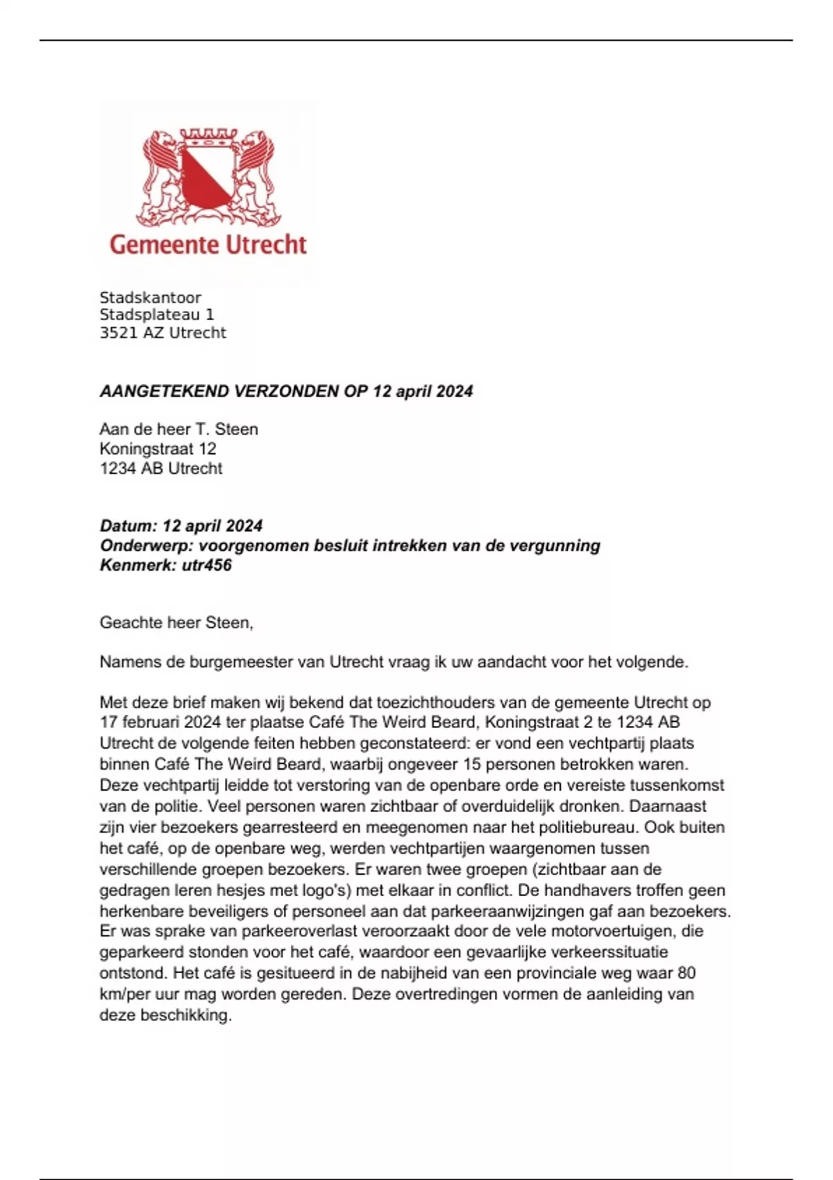 Namens de burgemeester van Utrecht vraag ik uw aandacht voor het volgende.