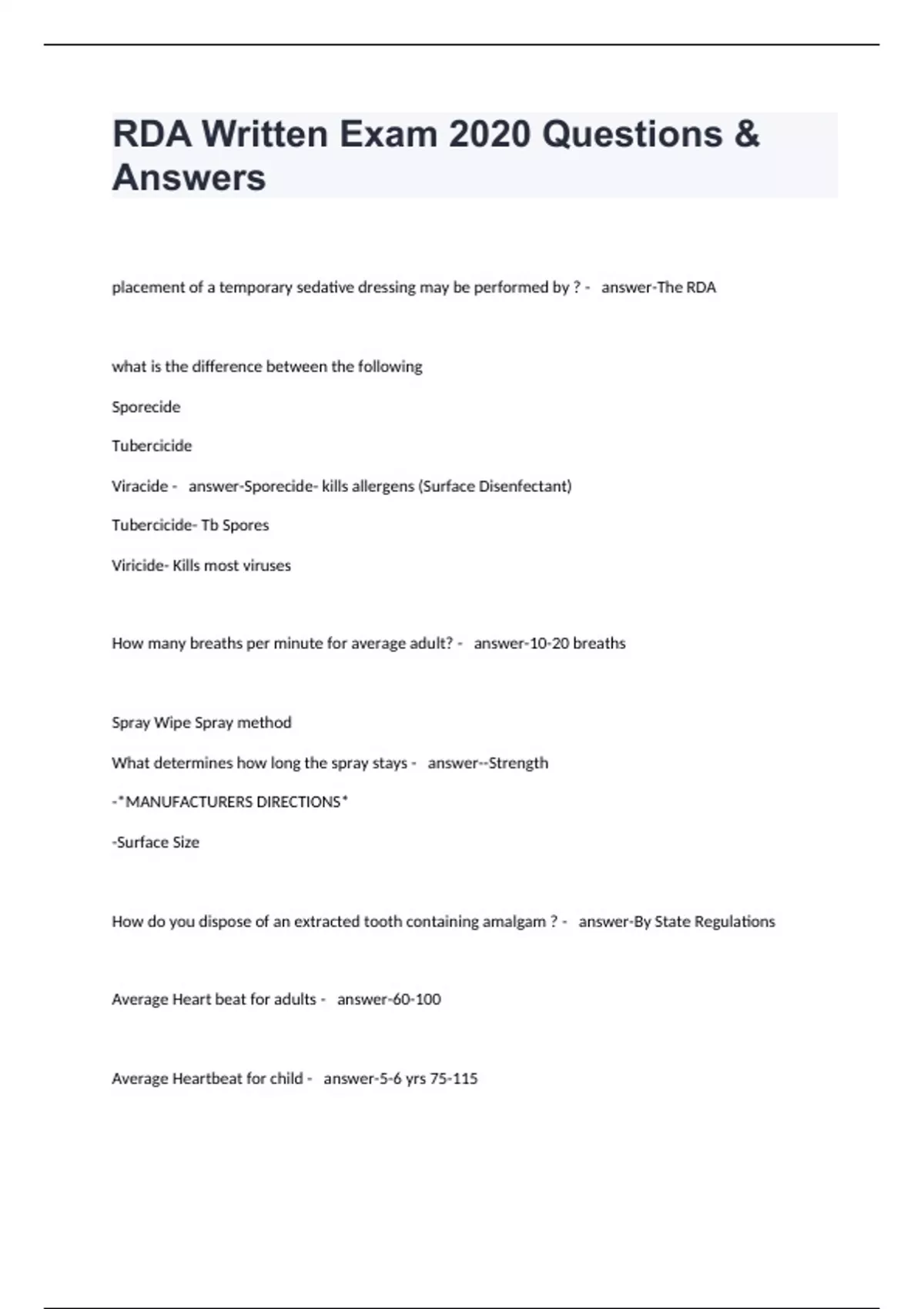 placement of a temporary sedative dressing may be performed by ? - answer-The RDA what is the difference between the following Sporecide Tubercicide Viracide - answer-Sporecide- kills allergens (Surface Disenfectant) Tubercicide- Tb Spores Viricide- Kills most viruses How many breaths per minute for average adult? - answer-10-20 breaths Spray Wipe Spray method What determines how long the spray stays - answer--Strength -*MANUFACTURERS DIRECTIONS* -Surface Size How do you dispose of an extracted tooth containing amalgam ? - answer-By State Regulations Average Heart beat for adults - answer-60-100 Average Heartbeat for child - answer-5-6 yrs 75-115
