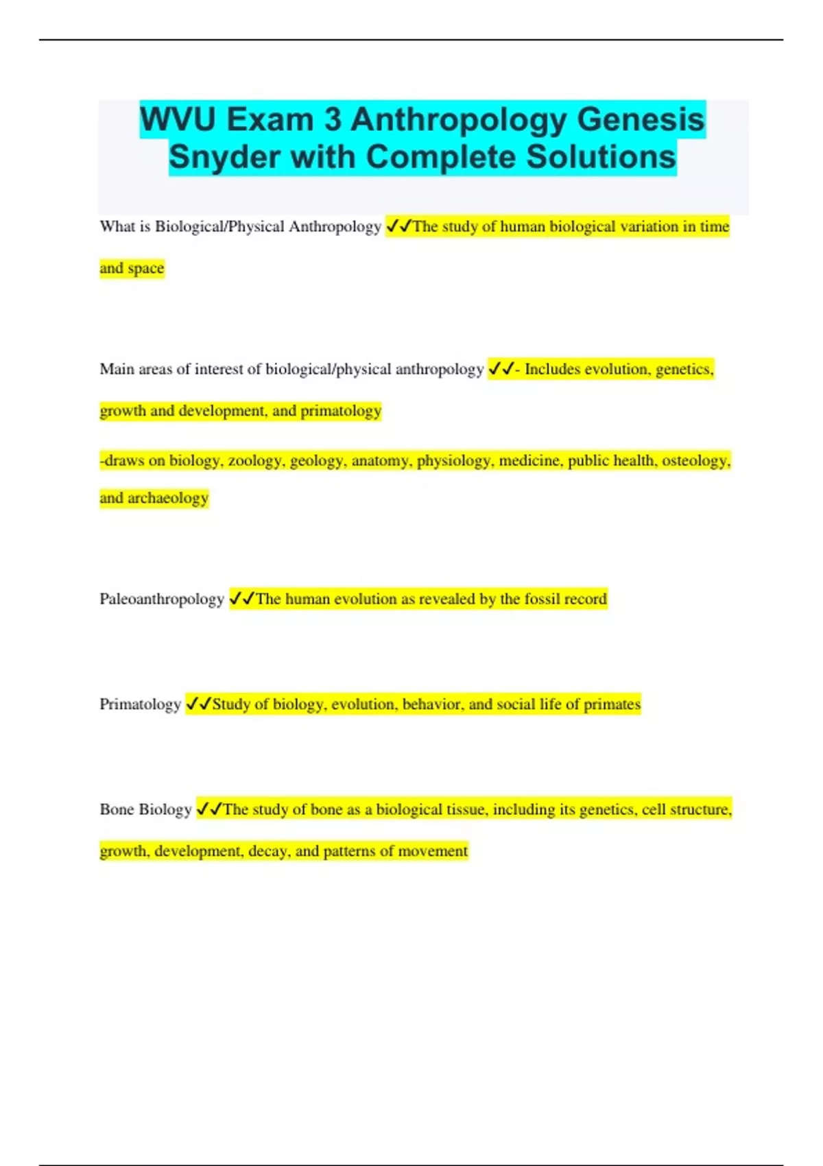 WVU Exam 3 Anthropology Genesis Snyder with Complete Solutions What is Biological/Physical Anthropology The study of human biological variation in time and space Main areas of interest of biological/physical anthropology - Includes evolution, genetics, growth and development, and primatology -draws on biology, zoology, geology, anatomy, physiology, medicine, public health, osteology, and archaeology Paleoanthropology The human evolution as revealed by the fossil record Primatology Study of biology, evolution, behavior, and social life of primates Bone Biology The study of bone as a biological tissue, including its genetics, cell structure, growth, development, decay, and patterns of movement Molecular Anthropology Uses genetic analysis, involving comparison of DNA sequences, to determine evolutionary links and distances among species and among ancient and modern populations Evolution Creationism idea that biological similarities and differences originated at the creation Catastrophism modified version of creationism that accounts for the fossil record by positing divinely authored worldwide disasters that wiped out creatures represented in the fossil record Natural Selection process by which nature selects the forms most suited to survive and reproduce in a given environment Darwin's Theory -influenced by Lyell's Principle of Uniformitarianism -Uniformitarianism states that past geological events can be best explained by observing the ongoing events of the present and generalizing backward through time Genetics -emerged after Darwin -helped us to understand the causes of biological variation and it explains the origin of the variety upon which natural selection operates Mendelian Genetics Studies ways in which chromosomes transmit genes across generations Biochemical Genetics Examines structure, function and changes in DNA Population Genetics Investigates natural selection and other causes of genetic variation, stability, and change in breeding populations Mutation -Changes in the DNA molecules of which genes and chromosomes are built -Most important source of variety upon which natural selection acts -Can be neutral Gene Pool refers to alleles and genotypes within breeding population Genetic Evolution Change in gene frequency: a change in the frequency of alleles in a breeding population from generation to generation
