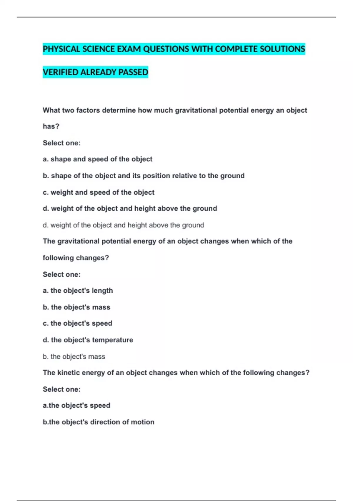 d. weight of the object and height above the ground