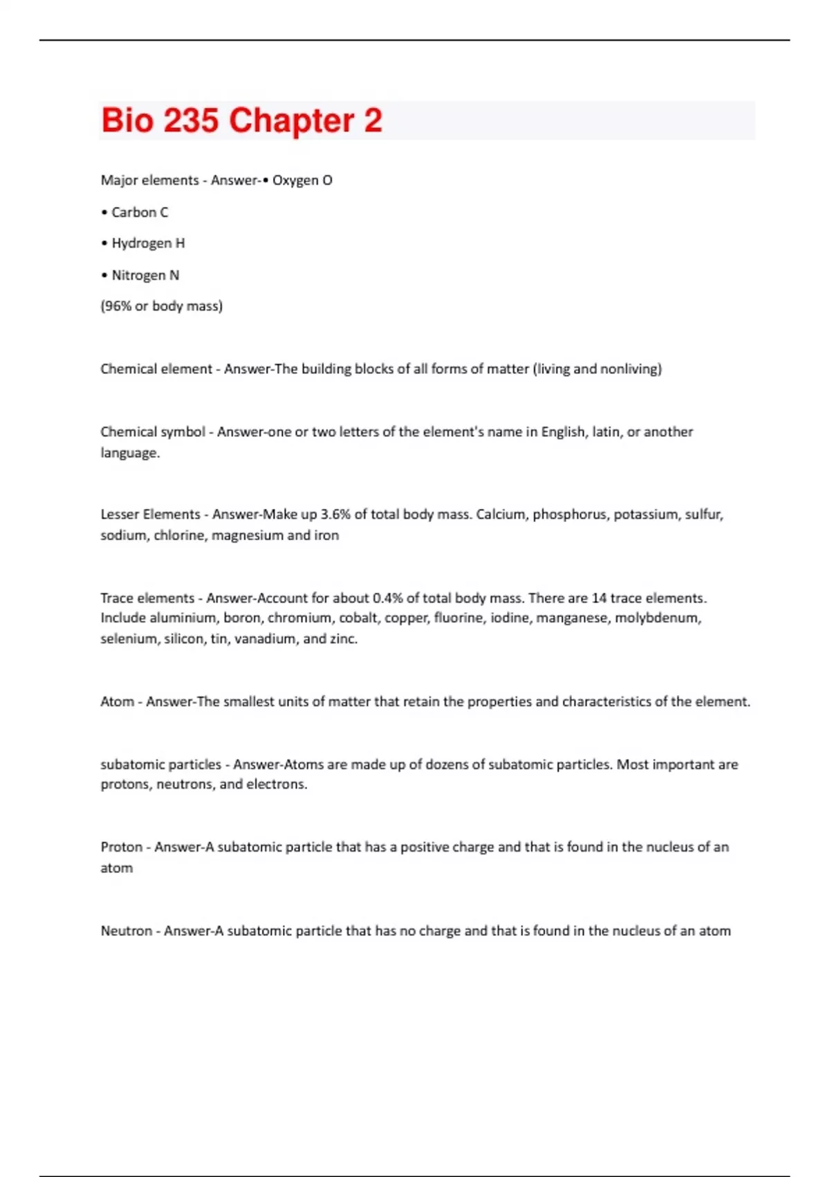 Major elements - Answer-• Oxygen O • Carbon C • Hydrogen H • Nitrogen N (96% or body mass) Chemical element - Answer-The building blocks of all forms of matter (living and nonliving) Chemical symbol - Answer-one or two letters of the element's name in English, latin, or another language. Lesser Elements - Answer-Make up 3.6% of total body mass. Calcium, phosphorus, potassium, sulfur, sodium, chlorine, magnesium and iron Trace elements - Answer-Account for about 0.4% of total body mass. There are 14 trace elements. Include aluminium, boron, chromium, cobalt, copper, fluorine, iodine, manganese, molybdenum, selenium, silicon, tin, vanadium, and zinc. Atom - Answer-The smallest units of matter that retain the properties and characteristics of the element. subatomic particles - Answer-Atoms are made up of dozens of subatomic particles. Most important are protons, neutrons, and electrons. Proton - Answer-A subatomic particle that has a positive charge and that is found in the nucleus of an atom Neutron - Answer-A subatomic particle that has no charge and that is found in the nucleus of an atomElectron - Answer-A subatomic particle that has a negative charge that move about in the large space surrounding the nucleus. electron shells - Answer-Depicted as simple circles around nucleus; each shell holds differing numbers of electrons atomic number - Answer-the number of protons in the nucleus of an atom mass number - Answer-the sum of the protons and neutrons in an atom isotopes - Answer-atoms of an element that have the same number of protons but different number of neutrons (and thus diff mass number) atomic mass/weight - Answer-average mass of all naturally occurring isotopes of that element Ion - Answer-an atom that has a positive or negative charge because it has unequal number of protons and electrons ionization - Answer-the process of giving up or gaining electrons molecule - Answer-when two or more atoms share electrons compound - Answer-a substance that contains atoms of two or more different elements free radical - Answer-an atom or group of atoms with an unpaired electron in the outermost shell Chemical bonds - Answer-the forces that hold together the atoms of a molecule or a compound Valence shell - Answer-the outermost shell of an atom (8 electrons= chemically stable)How are ionic bonds formed? - Answer-one atom gives up an electron to a second atom Cation - Answer-A positively charged ion Anion - Answer-A negatively charged ion Electrolyte - Answer-An ionic compound that breaks apart into positive and negative ions in a solution How are covalent bonds formed? - Answer-Atoms form a covalently bonded molecule by sharing one, two, or three pairs of valence electrons Single covalent bond - Answer-when two atoms share one electron pair Double covalent bond - Answer-when two atoms share two pairs of elctrons triple covalent bond - Answer-when two atoms share three pairs of electrons. the larger the number of shared electrons, the stronger the bond. nonpolar covalent bond - Answer-two atoms share the electons equally. always the case between two identical atoms. polar covalent bond - Answer-when the sharing of electrons between two atoms is unequal- the nucleus of one atom attracts the shared electrons more strongly that the nucleus of the other atom electronegativity - Answer-the power to attract electrons to itself