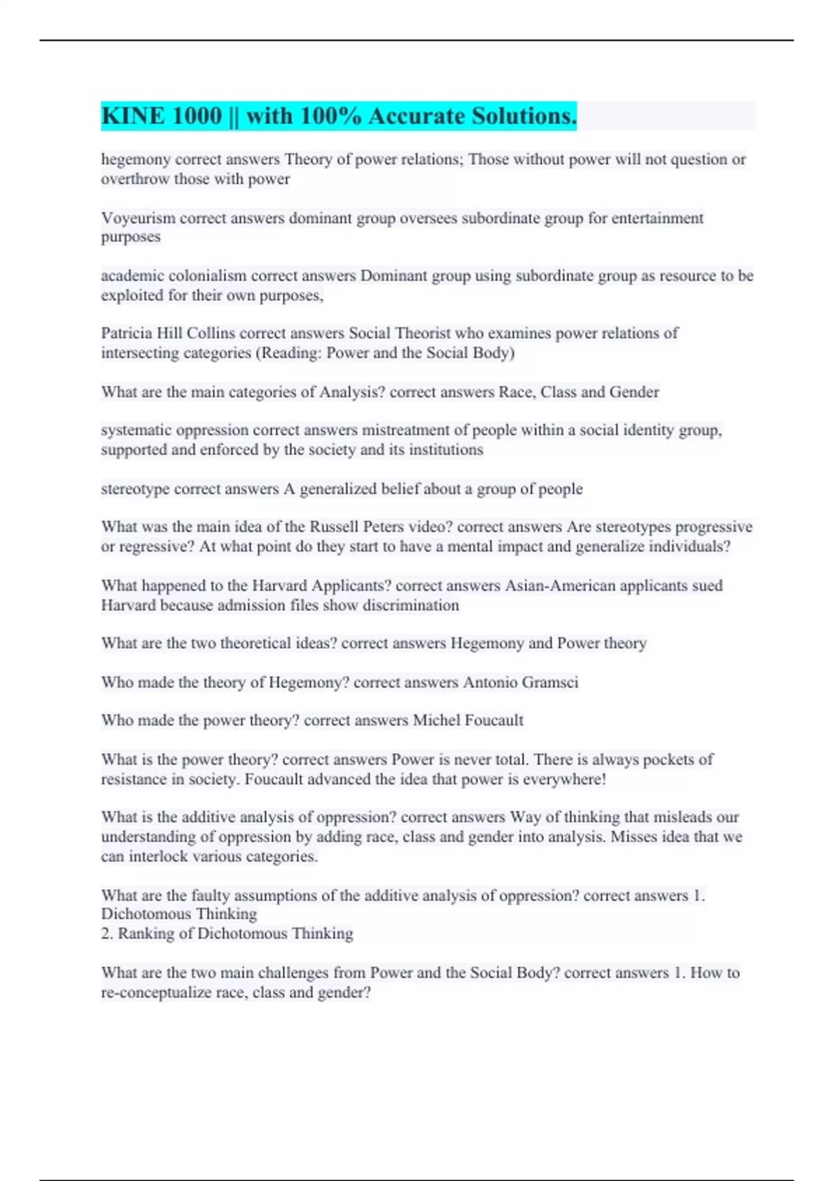 hegemony correct answers Theory of power relations; Those without power will not question or overthrow those with power Voyeurism correct answers dominant group oversees subordinate group for entertainment purposes academic colonialism correct answers Dominant group using subordinate group as resource to be exploited for their own purposes, Patricia Hill Collins correct answers Social Theorist who examines power relations of intersecting categories (Reading: Power and the Social Body) What are the main categories of Analysis? correct answers Race, Class and Gender systematic oppression correct answers mistreatment of people within a social identity group, supported and enforced by the society and its institutions stereotype correct answers A generalized belief about a group of people What was the main idea of the Russell Peters video? correct answers Are stereotypes progressive or regressive? At what point do they start to have a mental impact and generalize individuals? What happened to the Harvard Applicants? correct answers Asian-American applicants sued Harvard because admission files show discrimination What are the two theoretical ideas? correct answers Hegemony and Power theory Who made the theory of Hegemony? correct answers Antonio Gramsci Who made the power theory? correct answers Michel Foucault What is the power theory? correct answers Power is never total. There is always pockets of resistance in society. Foucault advanced the idea that power is everywhere! What is the additive analysis of oppression? correct answers Way of thinking that misleads our understanding of oppression by adding race, class and gender into analysis. Misses idea that we can interlock various categories. What are the faulty assumptions of the additive analysis of oppression? correct answers 1. Dichotomous Thinking 2. Ranking of Dichotomous Thinking What are the two main challenges from Power and the Social Body? correct answers 1. How to re-conceptualize race, class and gender?