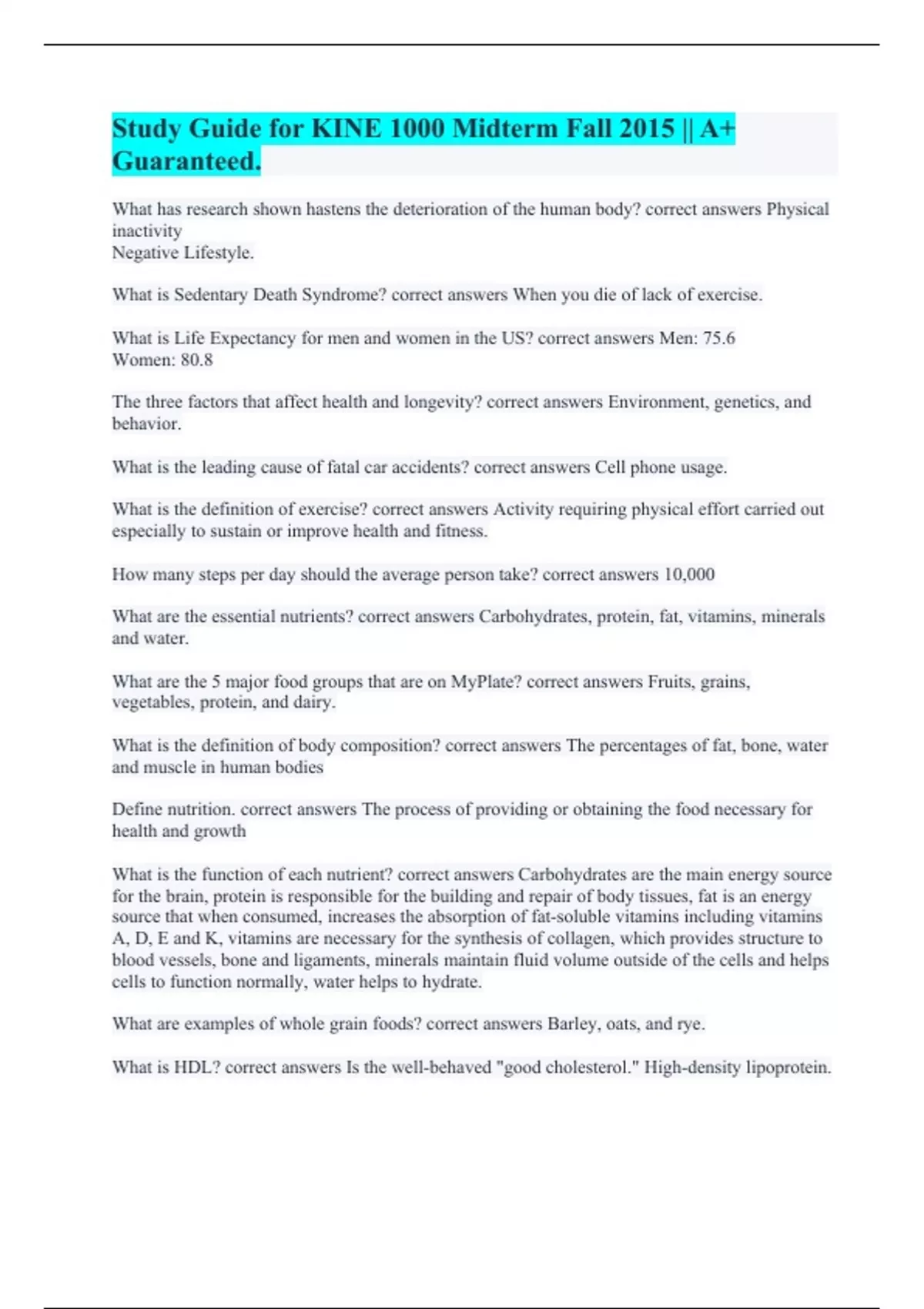 Study Guide for KINE 1000 Midterm Fall 2015 || A+ Guaranteed.
