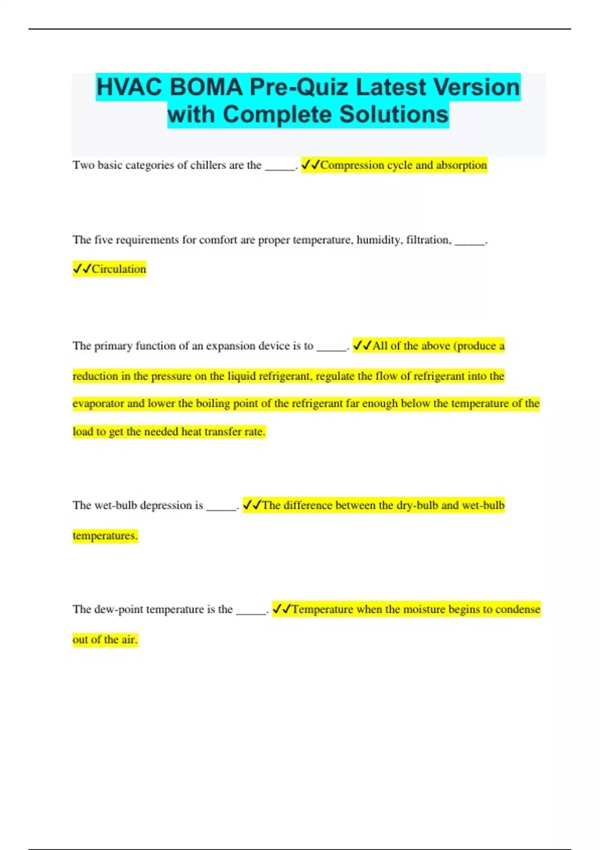 HVAC BOMA Pre-Quiz Latest Version with Complete Solutions