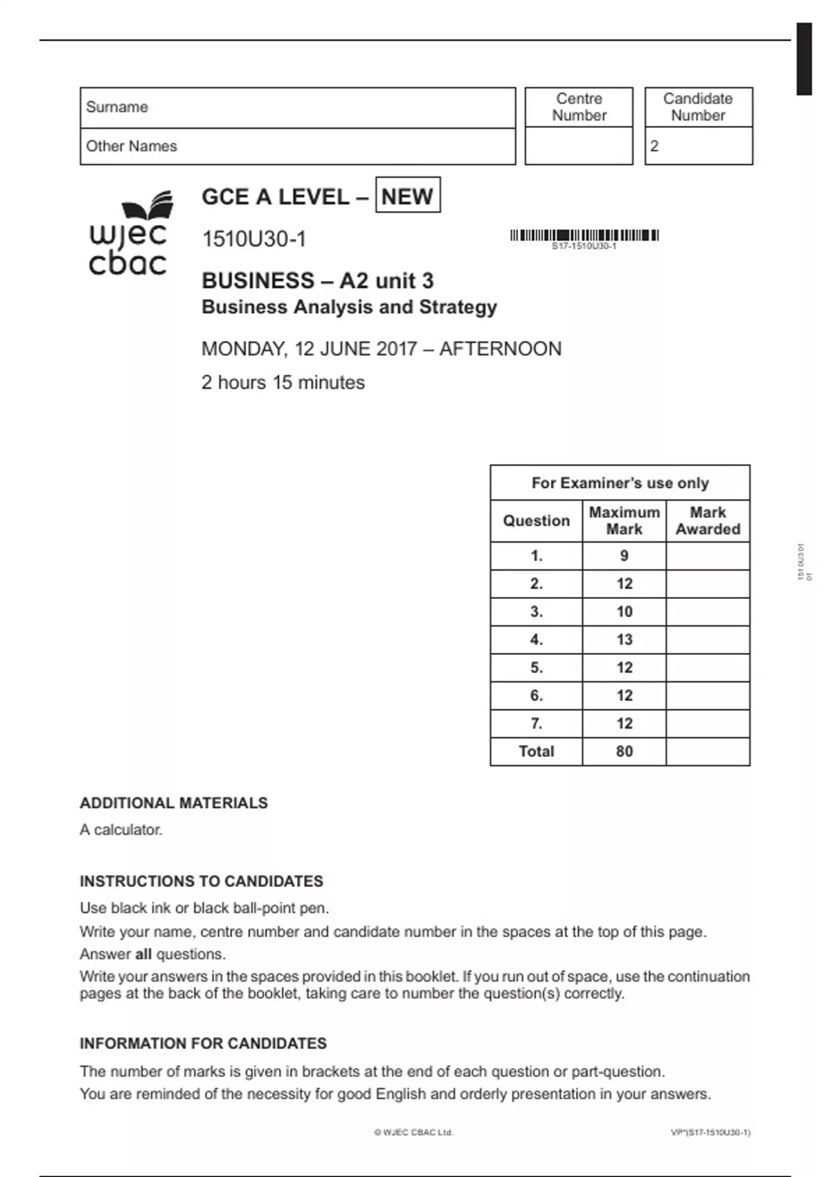 GCE A LEVEL – NEW 1510U30-1 BUSINESS – A2 unit 3 Business Analysis and Strategy