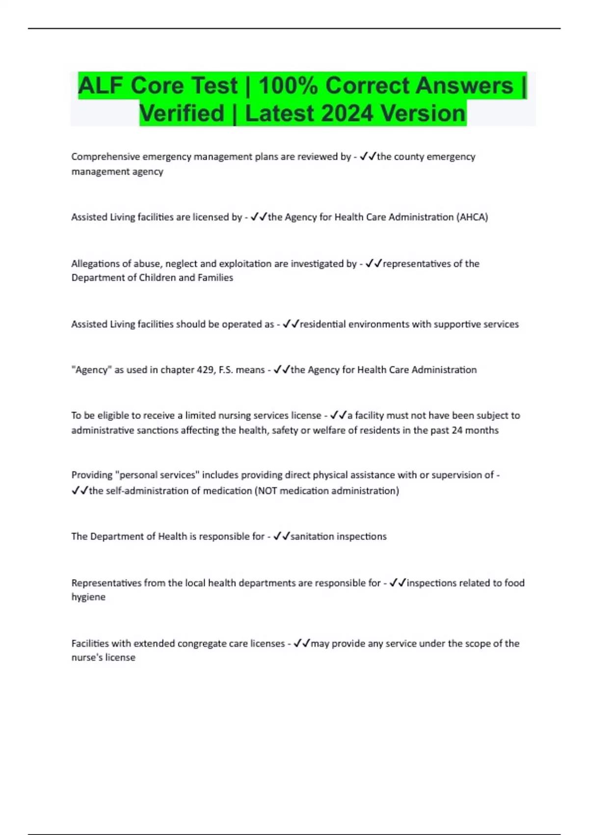 ALF Core Test | 100% Correct Answers | Verified | Latest 2024 Version Comprehensive emergency management plans are reviewed by - the county emergency management agency Assisted Living facilities are licensed by - the Agency for Health Care Administration (AHCA) Allegations of abuse, neglect and exploitation are investigated by - representatives of the Department of Children and Families Assisted Living facilities should be operated as - residential environments with supportive services "Agency" as used in chapter 429, F.S. means - the Agency for Health Care Administration To be eligible to receive a limited nursing services license - a facility must not have been subject to administrative sanctions affecting the health, safety or welfare of residents in the past 24 months Providing "personal services" includes providing direct physical assistance with or supervision of - the self-administration of medication (NOT medication administration) The Department of Health is responsible for - sanitation inspections Representatives from the local health departments are responsible for - inspections related to food hygiene Facilities with extended congregate care licenses - may provide any service under the scope of the nurse's license Assisted living facilities with a standard license may - employ nurses to administer medications to residents Any entity that provides housing, meals and one or more personal services to more than 2 persons who are not relatives for a period exceeding 24 hours must have an assisted living license unless - licensed as an Adult Family Care Home When a representative of the Department of Children and Families or the Agency for Health Care or the Long Term Care Ombudsman comes to your ALF - you may ask to see identification Assisted living services should be provided - in a manner that promotes the dignity and individuality of residents Operating an unlicensed assisted living facility is - a third-degree felony Facilities seeking to obtain an extended congregate care license - must develop policies and procedures and residency criteria specifically for extended congregate care Perimeter or egress control devices and equipment must - comply with all life safety requirements Residents sleeping rooms designed for double occupancy must have a minimum square footage of ___ usable floor space per occupant - 60 square feet Temperatures must be maintained at ___ when residents are normally awake - at least 72 degrees There must be at least one bathroom with at least one toilet and sink for every - 6 persons Resident bathrooms must have - a working door In order to license a room as a resident sleeping room - the room must be at least 80 square feet Legacy facilities that are fully sprinklered must conduct - 6 fire drills per year The shower or tub ratio to residents is - 1 to 8 An assisted living facility that receives its certificate of occupancy on or after July 1, 2016 must comply with - NFPA 101 and NFPA 101A current editions Assisted living facilities must provide
