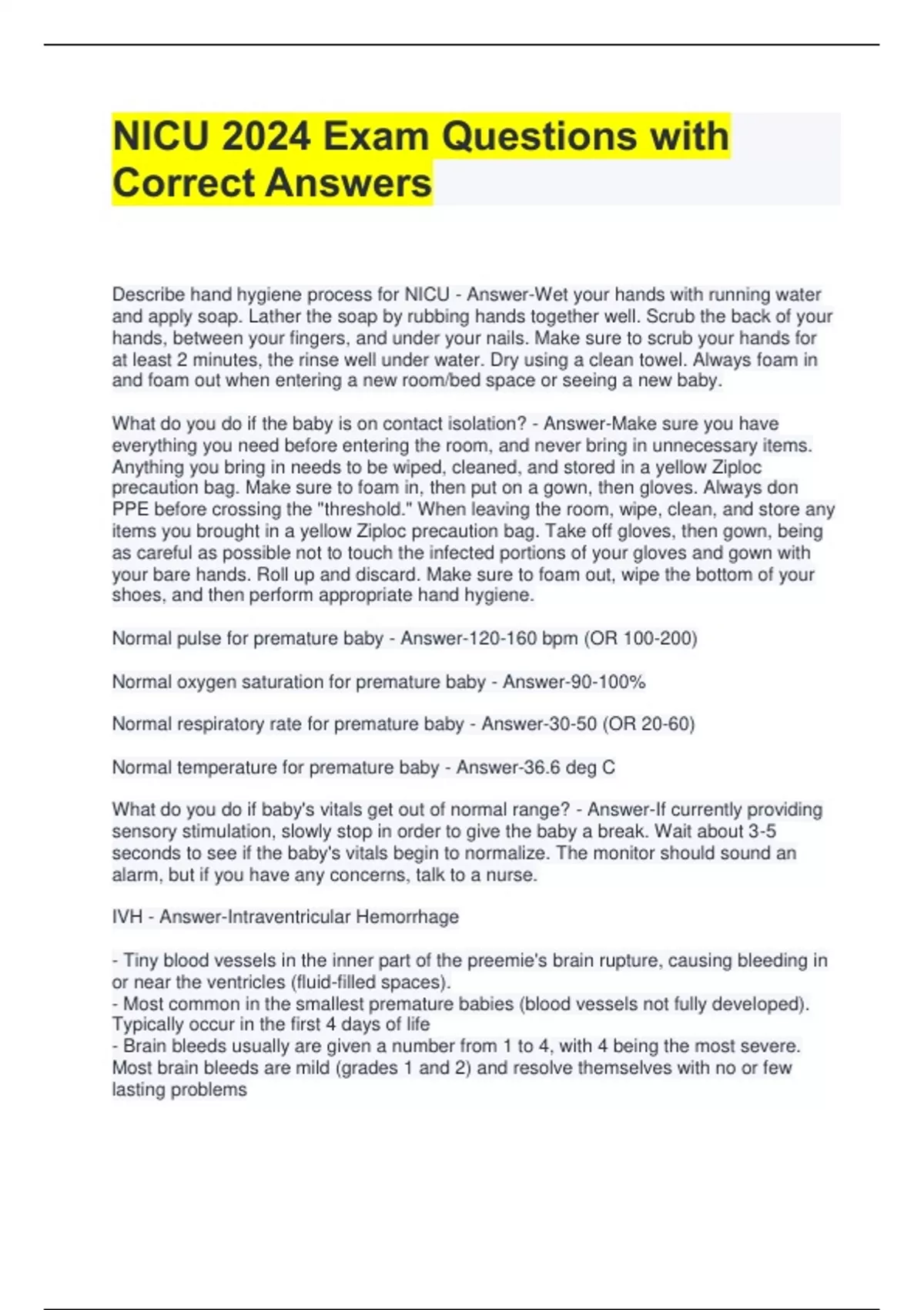 NICU 2024 Exam Questions with Correct Answers Describe hand hygiene process for NICU - Answer-Wet your hands with running water and apply soap. Lather the soap by rubbing hands together well. Scrub the back of your hands, between your fingers, and under your nails. Make sure to scrub your hands for at least 2 minutes, the rinse well under water. Dry using a clean towel. Always foam in and foam out when entering a new room/bed space or seeing a new baby. What do you do if the baby is on contact isolation? - Answer-Make sure you have everything you need before entering the room, and never bring in unnecessary items. Anything you bring in needs to be wiped, cleaned, and stored in a yellow Ziploc precaution bag. Make sure to foam in, then put on a gown, then gloves. Always don PPE before crossing the "threshold." When leaving the room, wipe, clean, and store any items you brought in a yellow Ziploc precaution bag. Take off gloves, then gown, being as careful as possible not to touch the infected portions of your gloves and gown with your bare hands. Roll up and discard. Make sure to foam out, wipe the bottom of your shoes, and then perform appropriate hand hygiene. Normal pulse for premature baby - Answer-120-160 bpm (OR 100-200) Normal oxygen saturation for premature baby - Answer-90-100% Normal respiratory rate for premature baby - Answer-30-50 (OR 20-60) Normal temperature for premature baby - Answer-36.6 deg C What do you do if baby's vitals get out of normal range? - Answer-If currently providing sensory stimulation, slowly stop in order to give the baby a break. Wait about 3-5 seconds to see if the baby's vitals begin to normalize. The monitor should sound an alarm, but if you have any concerns, talk to a nurse. IVH - Answer-Intraventricular Hemorrhage - Tiny blood vessels in the inner part of the preemie's brain rupture, causing bleeding in or near the ventricles (fluid-filled spaces). - Most common in the smallest premature babies (blood vessels not fully developed). Typically occur in the first 4 days of life - Brain bleeds usually are given a number from 1 to 4, with 4 being the most severe. Most brain bleeds are mild (grades 1 and 2) and resolve themselves with no or few lasting problems PVL - Answer-Periventricular Leukomalacia Injury to the white matter around the fluid-filled ventricles of the brain, resulting in the cells in the white matter either decaying or dying (Usually in frontal and parietal region of the brain), leaving empty areas which fill with fluid. Damage in this area can result in spasticity and intellectual impairment. EGA - Answer-Estimated gestational age Total time between first day of last normal menstrual period and the day of birth (calculated in complete weeks). Number of days the baby has been in utero. Gestational age does not include time after the baby is born PMA - Answer-Postmenstrual age The infant's increasing age in relation to the first day of the last menstrual period. This is determined by adding the gestational age to the weeks since birth. (Gestational age + chronological age) IUGR - Answer-Intrauterine growth restriction Fetal weight that is below the 10th percentile for gestational age as determined through ultrasound (fetus is smaller than expected for # of weeks of pregnancy, grows more slowly than usual in utero) RDS - Answer-Respiratory Distress Syndrome - Lungs are not yet fully developed, making it hard for the baby to breathe - Caused by insufficient pulmonary surfactant, which keeps the small air sacs in the lungs from collapsing. - Treatment with surfactant helps affected babies breathe more easily. May receive a treatment called C-PAP (continuous positive airway pressure). The air may be delivered through small tubes in the baby's nose, or through a tube that has been inserted into his windpipe. As with surfactant treatment, C-PAP helps keep small air sacs from collapsing BPD - Answer-Bronchopulmonary dysplasia