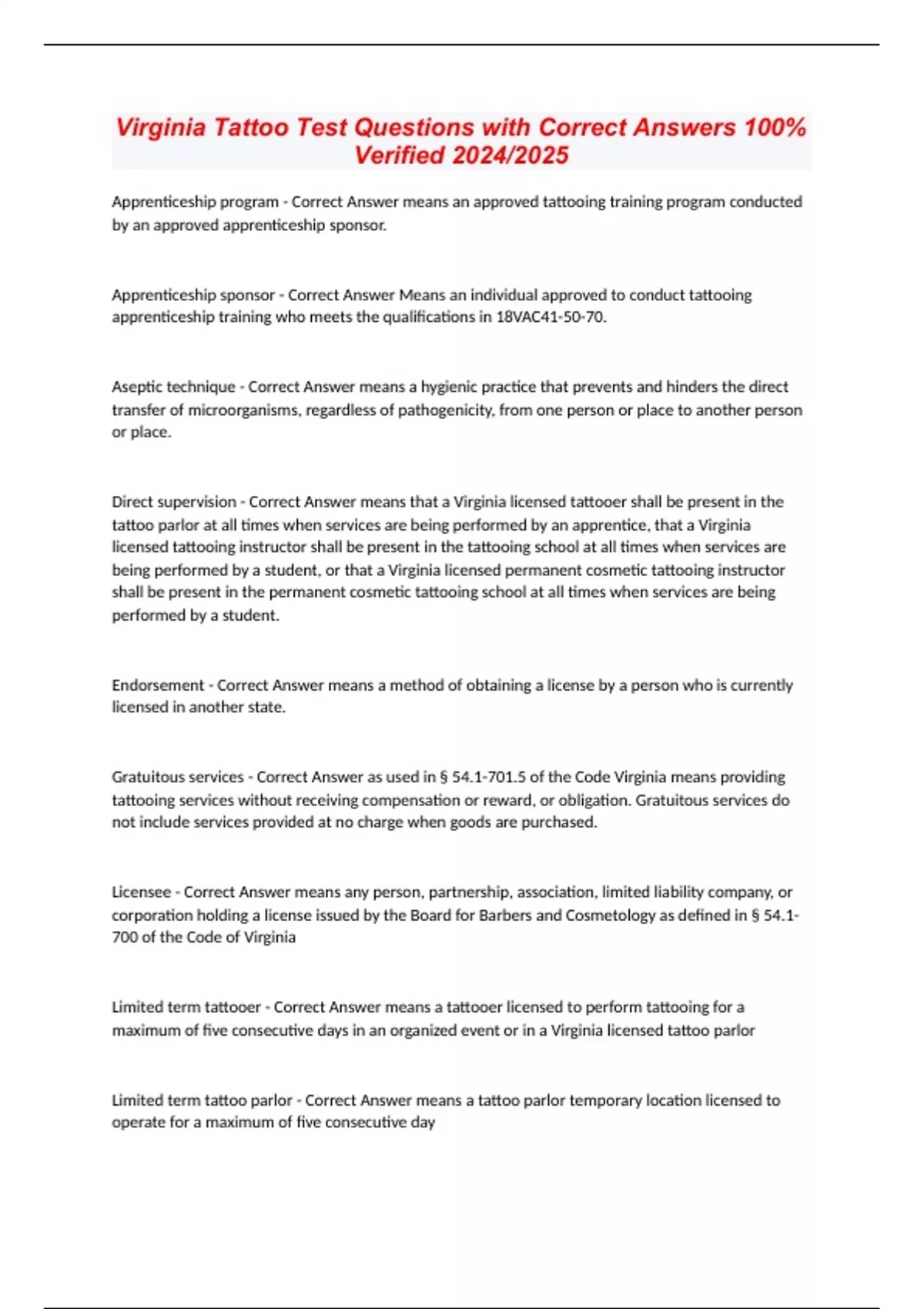 Virginia Tattoo Test Questions with Correct Answers 100% Verified 2024/2025 Apprenticeship program - Correct Answer means an approved tattooing training program conducted by an approved apprenticeship sponsor. Apprenticeship sponsor - Correct Answer Means an individual approved to conduct tattooing apprenticeship training who meets the qualifications in 18VAC41-50-70. Aseptic technique - Correct Answer means a hygienic practice that prevents and hinders the direct transfer of microorganisms, regardless of pathogenicity, from one person or place to another person or place. Direct supervision - Correct Answer means that a Virginia licensed tattooer shall be present in the tattoo parlor at all times when services are being performed by an apprentice, that a Virginia licensed tattooing instructor shall be present in the tattooing school at all times when services are being performed by a student, or that a Virginia licensed permanent cosmetic tattooing instructor shall be present in the permanent cosmetic tattooing school at all times when services are being performed by a student. Endorsement - Correct Answer means a method of obtaining a license by a person who is currently licensed in another state. Gratuitous services - Correct Answer as used in § 54.1-701.5 of the Code Virginia means providing tattooing services without receiving compensation or reward, or obligation. Gratuitous services do not include services provided at no charge when goods are purchased. Licensee - Correct Answer means any person, partnership, association, limited liability company, or corporation holding a license issued by the Board for Barbers and Cosmetology as defined in § 54.1-700 of the Code of Virginia Limited term tattooer - Correct Answer means a tattooer licensed to perform tattooing for a maximum of five consecutive days in an organized event or in a Virginia licensed tattoo parlor Limited term tattoo parlor - Correct Answer means a tattoo parlor temporary location licensed to operate for a maximum of five consecutive day Master permanent cosmetic tattooer - Correct Answer means any person who for compensation practices permanent cosmetic tattooing known in the industry as advanced permanent cosmetic tattooing including but not limited to cheek blush, eye shadow, breast and scar repigmentation or camouflage Permanent cosmetic tattoo salon - Correct Answer means any place in which permanent cosmetic tattooing is offered or practiced for compensation. Permanent cosmetic tattooer - Correct Answer means any person who for compensation practices permanent cosmetic tattooing known in the industry as basic permanent cosmetic tattooing including but not limited to eyebrows, eyeliners, lip coloring, lip liners, or full lips Permanent cosmetic tattooing - Correct Answer means placing marks upon or under the skin of any person with ink or any other substance, resulting in the permanent coloration of the skin on the face, including but not limited to eyebrows, eyeliners, lip coloring, lip liners, full lips, cheek blush, eye shadow, and on the body for breast and scar repigmentation or camouflage; also known as permanent make-up or micropigmentation. Permanent cosmetic tattooing instructor - Correct Answer means a person who has been certified by the board who meets the competency standards of the board as an instructor of permanent cosmetic tattooing Permanent cosmetic tattooing school - Correct Answer means a place or establishment licensed by the board to accept and train students and offers a permanent cosmetic tattooing curriculum approved by the board. Reinstatement - Correct Answer means having a license restored to effectiveness after the expiration date has passed. Renewal - Correct Answer means continuing the effectiveness of a license for another period of time. Sterilization area - Correct Answer means a separate room or area separate from workstations with restricted client access in which tattooing instruments are cleaned, disinfected, and sterilized. Tattooing instructor - Correct Answer means a person who has been certified by the board who meets the competency standards of the board as an instructor of tattooing. Temporary location - Correct Answer means a fixed location at which tattooing is performed for a specified le