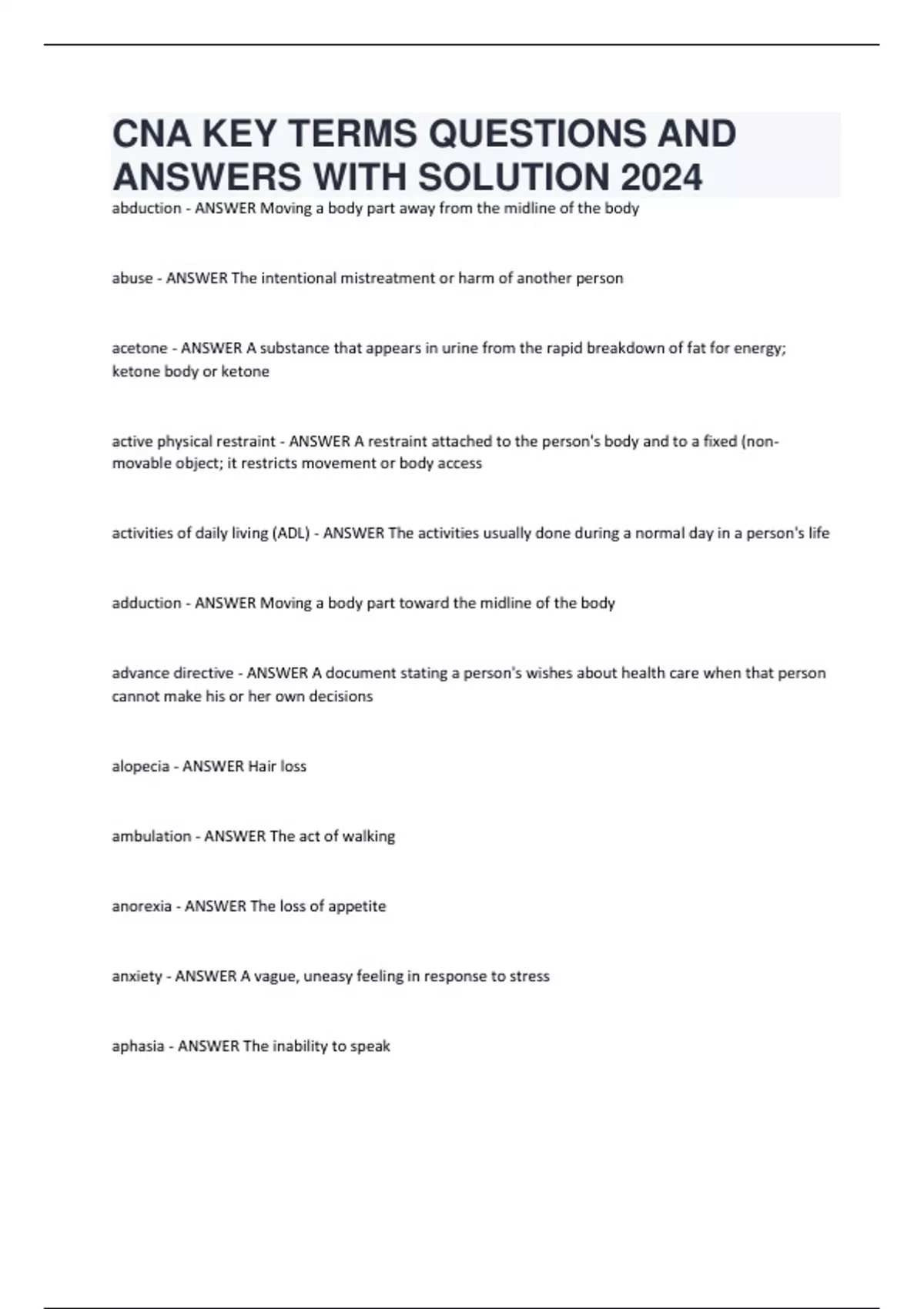 cna key terms questions and answers with solution