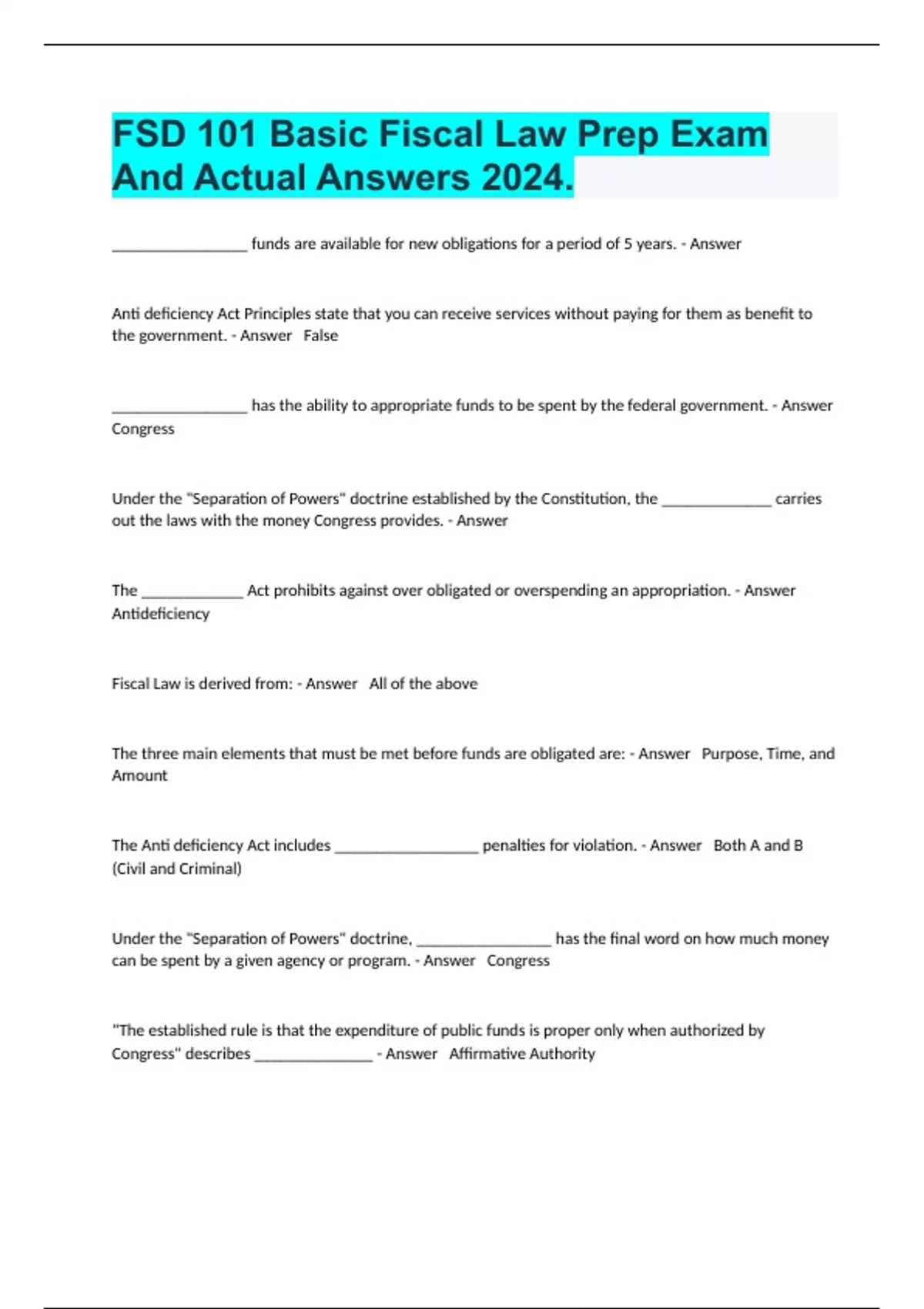 FSD 101 Basic Fiscal Law Prep Exam And Actual Answers 2024.