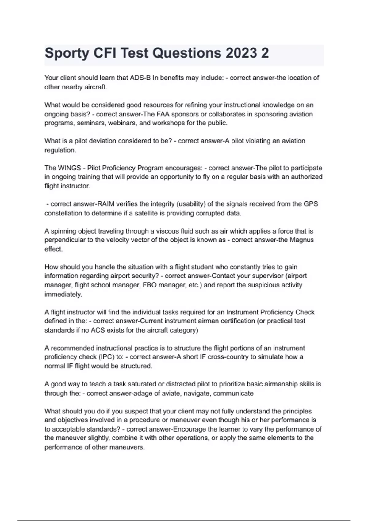 Sporty CFI Test Questions 2023 2