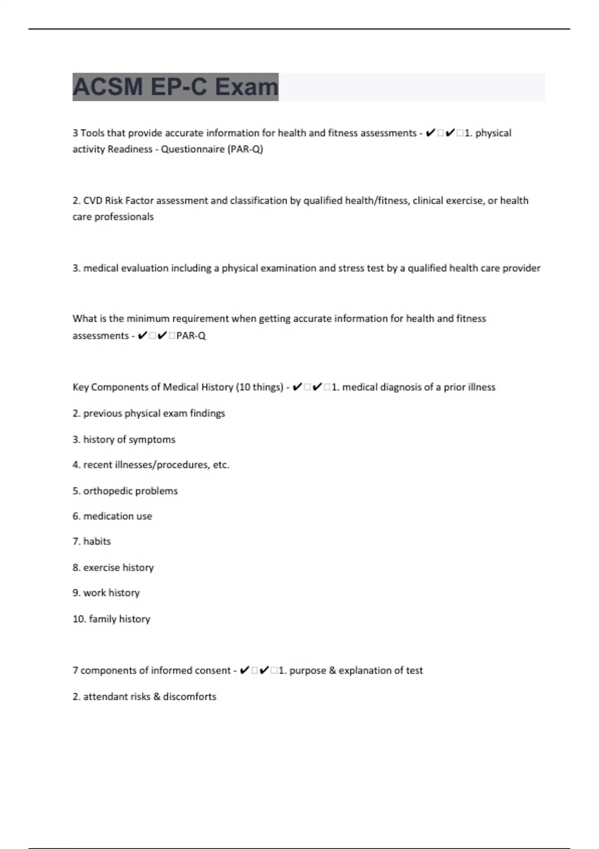 3 Tools that provide accurate information for health and fitness assessments - ️️1. physical activity Readiness - Questionnaire (PAR-Q) 2. CVD Risk Factor assessment and classification by qualified health/fitness, clinical exercise, or health care professionals 3. medical evaluation including a physical examination and stress test by a qualified health care provider What is the minimum requirement when getting accurate information for health and fitness assessments - ️️PAR-Q Key Components of Medical History (10 things) - ️️1. medical diagnosis of a prior illness 2. previous physical exam findings 3. history of symptoms 4. recent illnesses/procedures, etc. 5. orthopedic problems 6. medication use 7. habits 8. exercise history 9. work history 10. family history 7 components of informed consent - ️️1. purpose & explanation of test 2. attendant risks & discomforts