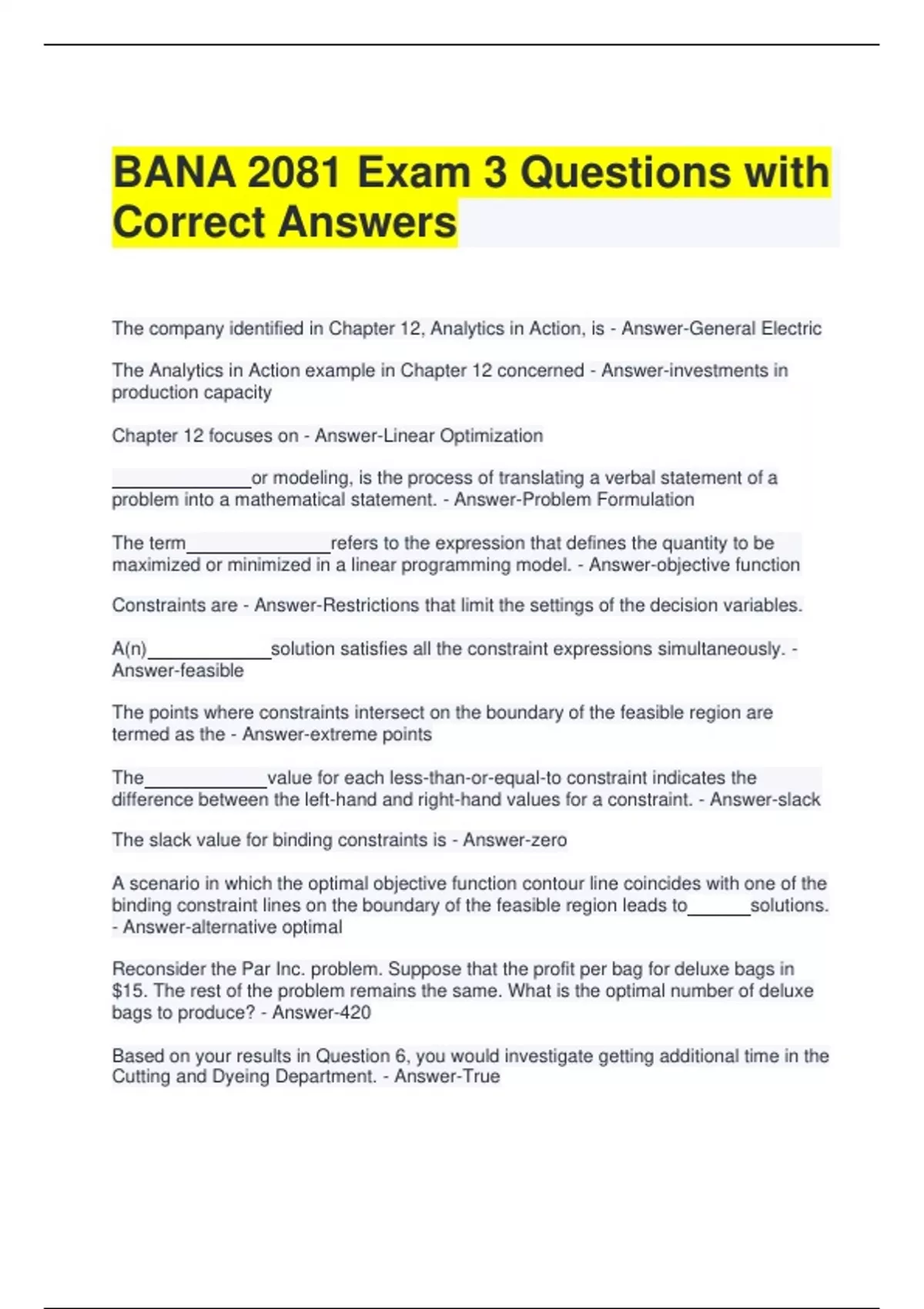 BANA 2081 Exam 3 Questions with Correct Answers The company identified in Chapter 12, Analytics in Action, is - Answer-General Electric The Analytics in Action example in Chapter 12 concerned - Answer-investments in production capacity Chapter 12 focuses on - Answer-Linear Optimization or modeling, is the process of translating a verbal statement of a problem into a mathematical statement. - Answer-Problem Formulation Constraints are - Answer-Restrictions that limit the settings of the decision variables. A(n) solution satisfies all the constraint expressions simultaneously. - Answer-feasible The points where constraints intersect on the boundary of the feasible region are termed as the - Answer-extreme points The slack value for binding constraints is - Answer-zero A scenario in which the optimal objective function contour line coincides with one of the binding constraint lines on the boundary of the feasible region leads to solutions. - Answer-alternative optimal Reconsider the Par Inc. problem. Suppose that the profit per bag for deluxe bags in $15. The rest of the problem remains the same. What is the optimal number of deluxe bags to produce? - Answer-420 Based on your results in Question 6, you would investigate getting additional time in the Cutting and Dyeing Department. - Answer-True Based on your results in Question 6, you would investigate getting additional time in the Finishing Department. - Answer-False Gatson manufacturing company produces 2 types of tires: Economy tire; Premium tire. The manufacturing time and the profit contribution per tire are given in the following table. Operation Manufacturing Time (Hours) Time Available Economy tires Premium tires Hours Material Preparation 4/3 1/2 600 Tire Building 4/5 1 650 Curing 1/2 2/4 580 Final Inspection 1/5 1/3 120 Profit/Tire $12 $10 Answer the following assuming that the company is interested in maximizing the total profit contribution. Develop a spreadsheet model and find the optimal solution using Excel Solver. What is the total profit contribution Gatson can earn with the optimal production quantities? Enter your answer without a dollar sign and rounded to two decimal places. - Answer- 6038.71 Based on your answer to Question 1, how many Economy tires should Gatson manufacture to maximize profit contribution? Round your answer to one decimal place. - Answer-406.5 Based on your answer to Question 1, how many Premium tires should Gatson manufacture to maximize profit contribution? Round your answer to one decimal place. - Answer-116.1 The supervisor of a manufacturing plant is trying to determine how many of two parts, Part X and Part Y, are to be produced per day. Each part must be processed in three sections of the plant. The time required for the production along with the profit contribution for each part are given in the following table. Time required (Minutes/Unit) Section 1Section 2Section 3Profit/UnitPart X 50 30 18 $2 Part Y 80 45 22 $3 Available time (minutes) 3600 2500 1200 No more than 60 units of Part X and up to 70 units of Part Y can be produced per day. The company already has orders for 30 units of Part Y that must be satisfied. Develop a spreadsheet model and find the solution that maximizes total profit contribution. What is the value of the objective function? Enter your answer without a dollar sign. - Answer-138 Based on your answer to Question 4, what quantity of Part X should be produced to maximize profit contribution? - Answer-24 Based on your answer to Question 4, what quantity of Part Y should be produced to maximize profit contribution? - Answer-30 The Pat-A-Cake Pastry Shop makes chocolate cake in three sizes - Small, Medium, and Large. The shop has the following amounts of the three main ingredients on hand - 400 ounces of cake flour, 550 ounces of caster sugar, and 150 ounces of cocoa powder. The table below provides details on the amount of each ingredient required for each cake size as well as the profit contributions. Cake Small Medium Large Available Plain flour (Ounce) 8 400 Caster sugar (Ounce) 18 22 25 550 Cocoa powder (Ounce) 3 5 11 150 Profit/Unit $18 $25 $32 Develop a spreadsheet model and find the optimal solution using Excel Solver. What is the optimal value of the objective function? Enter your answer without a dollar sign and round the answer to two decimal places. - Answer-636.84 Based on your answer to Question 7, what quantity of small cakes should be produced to maximize profit contribution? Round your answer to one decimal place. - Answer-2.9 Based on your answer to Question 7, what quantity of medium cakes should be produced to maximize profit contribution? Round your answer to one decimal place. - Answer-16.6 Based on your answer to Question 7, what quantity of large cakes should be produced to maximize profit contribution? Round your answer to one decimal place. - Answer-5.3 is the situation in which no solution to the linear programming problem satisfies all the constraints. - Answer-Infeasibilty