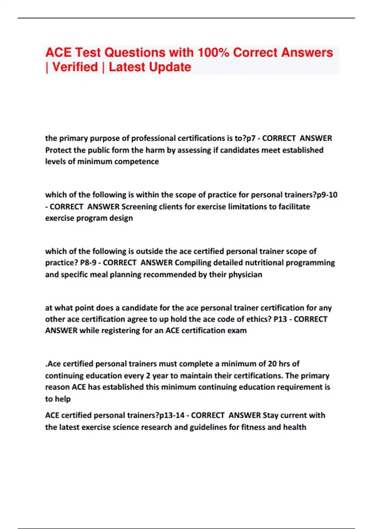ACE Test Questions with 100% Correct Answers | Verified | Latest Updatethe primary purpose of professional certifications is to?p7 - CORRECT ANSWER Protect the public form the harm by assessing if candidates meet established levels of minimum competence which of the following is within the scope of practice for personal trainers?p9-10 - CORRECT ANSWER Screening clients for exercise limitations to facilitate exercise program design which of the following is outside the ace certified personal trainer scope of practice? P8-9 - CORRECT ANSWER Compiling detailed nutritional programming and specifi