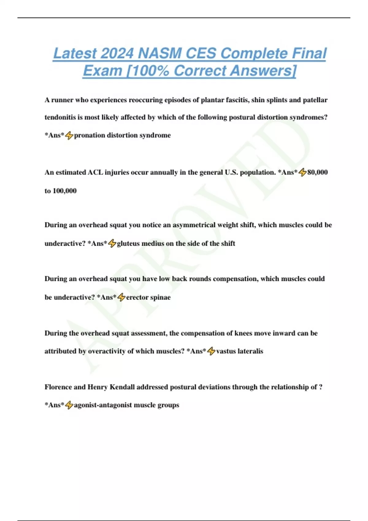Latest 2024 NASM CES Complete Final Exam [100% Correct Answers] A runner who experiences reoccuring episodes of plantar fascitis, shin splints and patellar tendonitis is most likely affected by which of the following postural distortion syndromes? *Ans* pronation distortion syndrome An estimated ACL injuries occur annually in the general U.S. population. *Ans* 80,000 to 100,000 During an overhead squat you notice an asymmetrical weight shift, which muscles could be underactive? *Ans* gluteus medius on the side of the shift During an overhead squat you have low back rounds compensation, which muscles could be underactive? *Ans* erector spinae During the overhead squat assessment, the compensation of knees move inward can be attributed by overactivity of which muscles? *Ans* vastus lateralis Florence and Henry Kendall addressed postural deviations through the relationship of ? *Ans* agonist-antagonist muscle groups Flexion of the ankle is called *Ans* dorsiflexion For a foot and ankle impairment what muscle should receive SMR? *Ans* biceps femoris If the knees move inward what muscles would receive static stretching? *Ans* TFL If client demonstrates an asymmetric shift which muscles should receive static stretching? *Ans* TFL same side If low back arches which muscles should receive SMR? *Ans* Latissimus dorsi Functionally tightened or overactive muscles accompanying the lower extremity movement impairment syndrome include *Ans* peroneals, gastrocnemius, soleus, hamstrings, IT band, adductors Having an excessive forward lean in an overhead squat during LPHC movement compensation what muscles may be overactive? *
