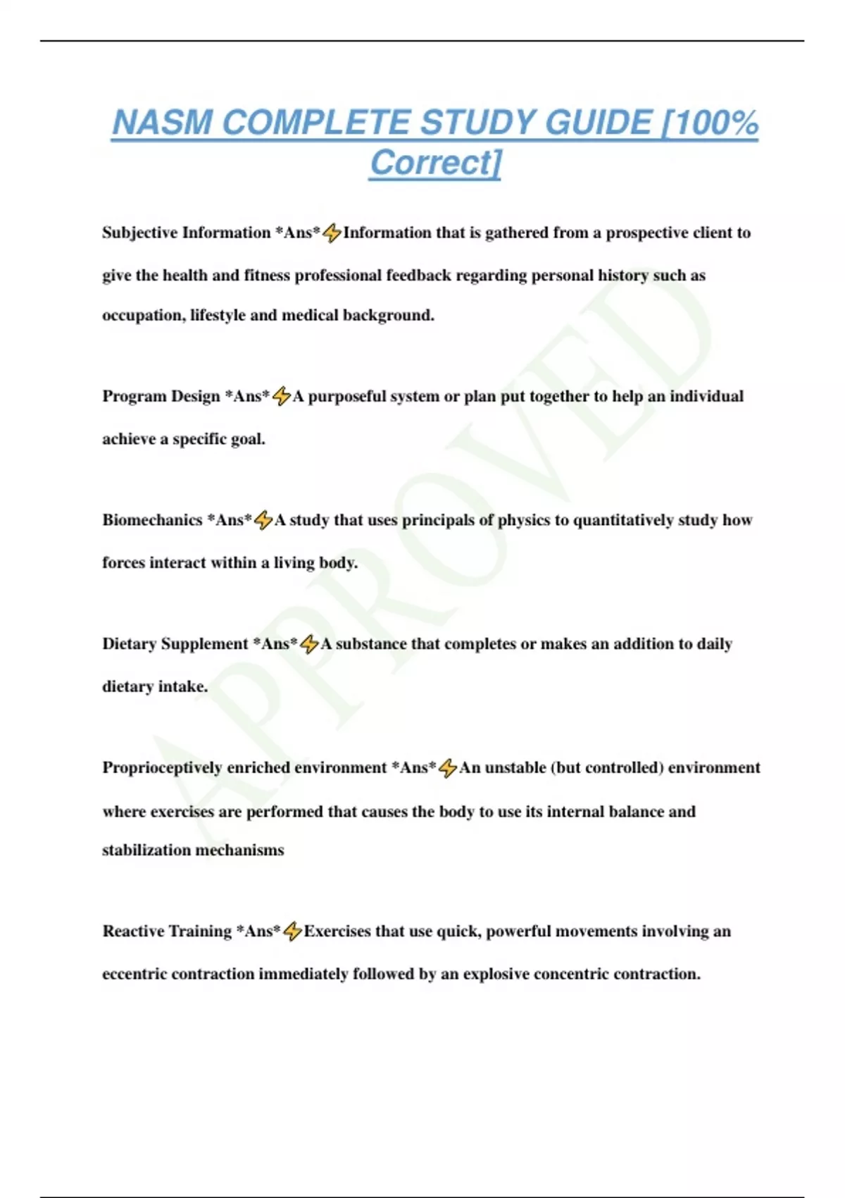 NASM COMPLETE STUDY GUIDE [100% Correct] Subjective Information *Ans* Information that is gathered from a prospective client to give the health and fitness professional feedback regarding personal history such as occupation, lifestyle and medical background. Program Design *Ans* A purposeful system or plan put together to help an individual achieve a specific goal. Biomechanics *Ans* A study that uses principals of physics to quantitatively study how forces interact within a living body. Dietary Supplement *Ans* A substance that completes or makes an addition to daily dietary intake. Proprioceptively enriched environment *Ans* An unstable (but controlled) environment where exercises are performed that causes the body to use its internal balance and stabilization mechanisms Reactive Training *Ans* Exercises that use quick, powerful movements involving an eccentric contraction immediately followed by an explosive concentric contraction. Obesity *Ans* Fastest growing health problem in the US The Nervous System *Ans* It is a conglomeration of billions of cells forming nerves that are specifically designed to provide a communication network within the human body nervous system, skeletal system and muscular system *Ans* kinetic chain Heart *Ans* Muscular pump that rhythmically contracts to push blood throughout the body Dynamic Joint Stabilization *Ans* The ability of the kinetic chain to stabilize a joint during movement. Speed *Ans* The ability to move the body in one intended direction as fast as possible. The Core *Ans* The lumbo-pelvic -hip complex and the thoracic and cervical spine, where the body's center of gravity is locate