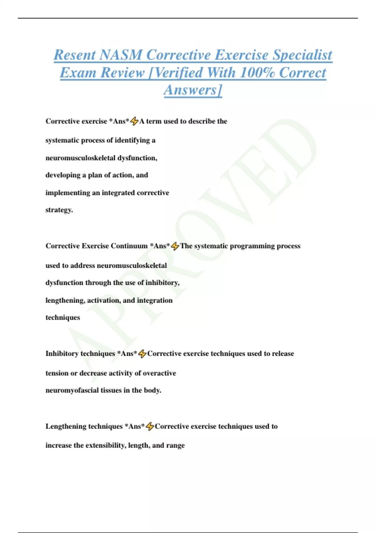 Resent NASM Corrective Exercise Specialist Exam Review [Verified With 100% Correct Answers] Corrective exercise *Ans* A term used to describe the systematic process of identifying a neuromusculoskeletal dysfunction, developing a plan of action, and implementing an integrated corrective strategy. Corrective Exercise Continuum *Ans* The systematic programming process used to address neuromusculoskeletal dysfunction through the use of inhibitory, lengthening, activation, and integration techniques Inhibitory techniques *Ans* Corrective exercise techniques used to release tension or decrease activity of overactive neuromyofascial tissues in the body. Lengthening techniques *Ans* Corrective exercise techniques used to increase the extensibility, length, and range of motion of neuromyofascial tissues in the body. Activation techniques *Ans* Corrective exercise techniques used to reeducate or increase activation of underactive tissues. Corrective exercise techniques used to retrain the collective synergistic function of all muscles through functionally progressive movements. *Ans* Integration techniques the International Obesity Task Force *Ans* In 1985, deemed the prevalence of obesity________________ an epidemic one third 33% *Ans* Today, approximately _______ of adults are estimated to be obese overweight *Ans* 18% of today's adolescents and teenagers are considered 40 years ago *Ans* Research suggests that musculoskeletal pain is more common now than it was__________because of the advancements of technology and manuallabor-saving devices. 1 million ambulatory care (doctor) visits per year *Ans* In the general population, plantar fasciitis accounts for more tha
