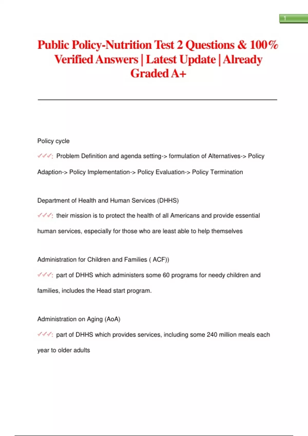 Public Policy-Nutrition Test 2 Questions & 100% Verified Answers | Latest Update | Already Graded A+