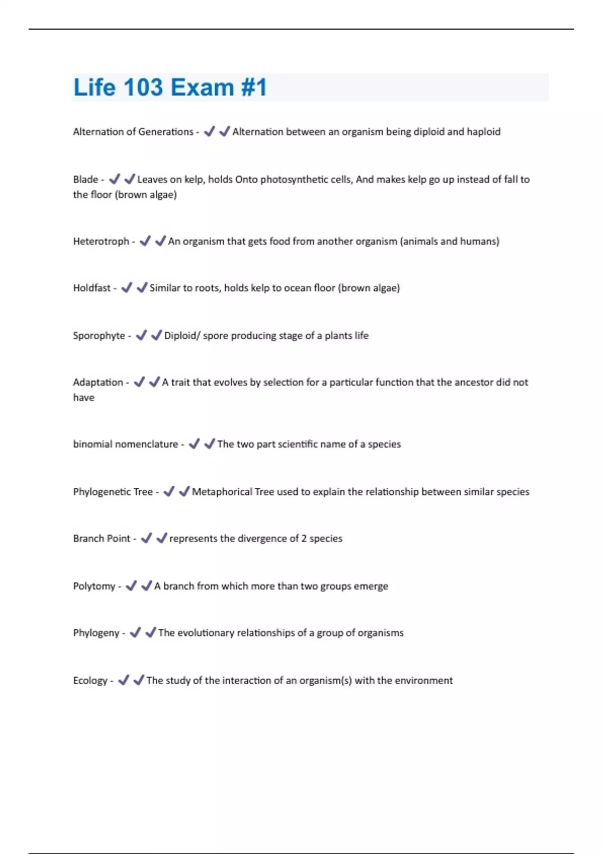 Life 103 Exam #1 Questions And Answers With Verified Study Solutions