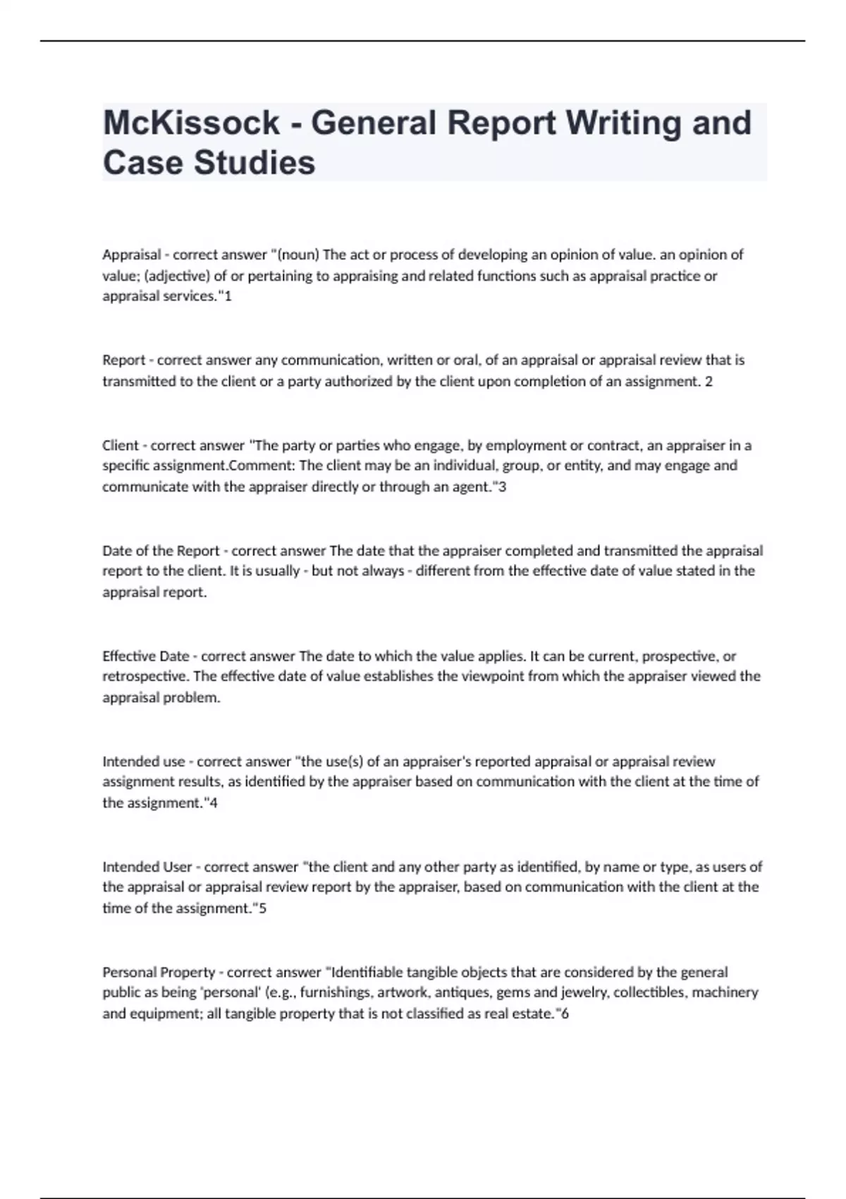 McKissock - General Report Writing and Case Studies Question and answers 100% correct McKissock - General Report Writing and Case Studies Appraisal - correct answer "(noun) The act or process of developing an opinion of value. an opinion of value; (adjective) of or pertaining to appraising and related functions such as appraisal practice or appraisal services."1 Report - correct answer any communication, written or oral, of an appraisal or appraisal review that is transmitted to the client or a party authorized by the client upon completion of an assignment. 2 Client - correct answer "The party or parties who engage, by employment or contract, an appraiser in a specific assignment.Comment: The client may be an individual, group, or entity, and may engage and communicate with the appraiser directly or through an agent."3 Date of the Report - correct answer The date that the appraiser completed and transmitted the appraisal report to the client. It is usually - but not always - different from the effective date of value stated in the appraisal report. Effective Date - correct answer The date to which the value applies. It can be current, prospective, or retrospective. The effective date of value establishes the viewpoint from which the appraiser viewed the appraisal problem. Intended use - correct answer "the use(s) of an appraiser's reported appraisal or appraisal review assignment result