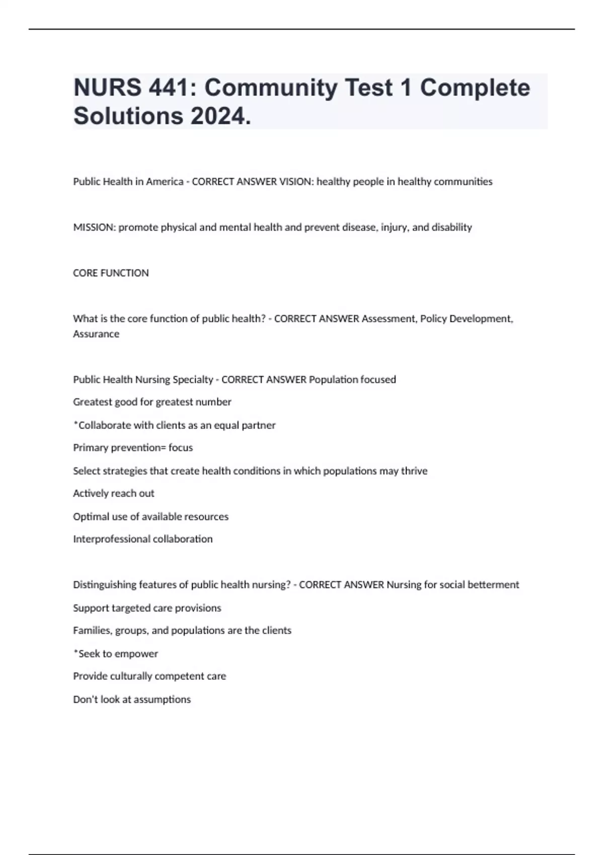 NURS 441: Community Test 1 Complete Solutions 2024. Public Health in America - CORRECT ANSWER VISION: healthy people in healthy communities MISSION: promote physical and mental health and prevent disease, injury, and disability CORE FUNCTION What is the core function of public health? - CORRECT ANSWER Assessment, Policy Development, Assurance Public Health Nursing Specialty - CORRECT ANSWER Population focused Greatest good for greatest number *Collaborate with clients as an equal partner Primary prevention= focus Select strategies that create health conditions in which populations may thrive Actively reach out Optimal use of available resources Interprofessional collaboration Distinguishing features of public health nursing? - CORRECT ANSWER Nursing for social betterment Support targeted care provisions Families, groups, and populations are the clients *Seek to empower Provide culturally competent care Don't look at assumptions Goal of public health nursing - CORRECT ANSWER Care in the here and now Personal and intimate Recognize uniqueness Primary prevention - CORRECT ANSWER Actions that change overall background conditions to prevent some unwanted event or circumstance, such as injury, disease, or abuse. Education secondary prevention programs - CORRECT ANSWER programs that provide treatment, such as psychological counseling, to youths and adults after they have violated the law tertiary prevention examples - CORRECT ANSWER - enhance rehabilitation from disease, injury, or disability - Provide cardiac rehabilitation, medication, and surgery. - medical treatment - physical and occupational therapy, and rehabilitation - Monitor the use of prescription medications and adherence to treatment to reduce risk for illness complications - Provide health promotion activities to persons with serious and persistent mental illness. - Promote support group participation for those with mental health disabilities. - The public health nurse provides a diabetes clinic for a defined population of adults in a low-income housing unit of the community. - If blood pressure cannot be controlled by diet, refer the client to a physician or nurse practitioner for medication; advise the client to engage in a cardiac program that will oversee diet and exercise.