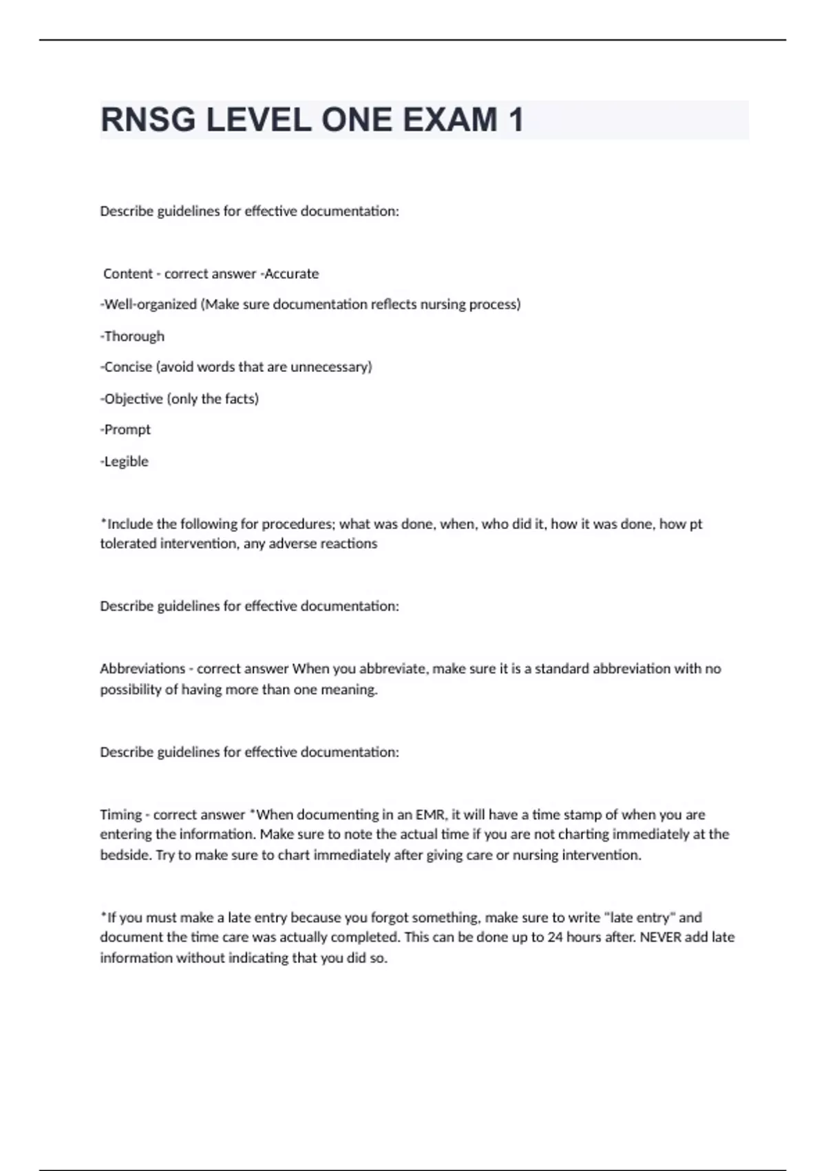RNSG LEVEL ONE EXAM 1 Question and answers 100% correct RNSG LEVEL ONE EXAM 1 Describe guidelines for effective documentation: Content - correct answer -Accurate -Well-organized (Make sure documentation reflects nursing process) -Thorough -Concise (avoid words that are unnecessary) -Objective (only the facts) -Prompt -Legible *Include the following for procedures; what was done, when, who did it, how it was done, how pt tolerated intervention, any adverse reactions Describe guidelines for effective documentation: Abbreviations - correct answer When you abbreviate, make sure it is a standard abbreviation with no possibility of having more than one meaning. Describe guidelines for effective documentation: