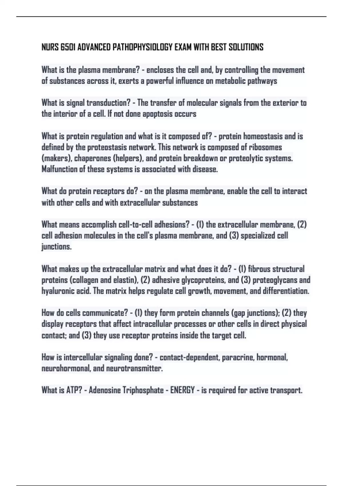 NURS 6501 ADVANCED PATHOPHYSIOLOGY EXAM WITH BEST SOLUTIONS What is the plasma membrane? - encloses the cell and, by controlling the movement of substances across it, exerts a powerful influence on metabolic pathways What is signal transduction? - The transfer of molecular signals from the exterior to the interior of a cell. If not done apoptosis occurs What is protein regulation and what is it composed of? - protein homeostasis and is defined by the proteostasis network. This network is composed of ribosomes (makers), chaperones (helpers), and protein breakdown or proteolytic systems. Malfunction of these systems is associated with disease. What do protein receptors do? - on the plasma membrane, enable the cell to interact with other cells and with extracellular substances What means accomplish cell-to-cell adhesions? - (1) the extracellular membrane, (2) cell adhesion molecules in the cell's plasma membrane, and (3) specialized cell junctions. What makes up the extracellular matrix and what does it do? - (1) fibrous structural proteins (collagen and elastin), (2) adhesive glycoproteins, and (3) proteoglycans and hyaluronic acid. The matrix helps regulate cell growth, movement, and differentiation. How do cells communicate? - (1) they form protein channels (gap junctions); (2) they display receptors that affect intracellular processes or other cells in direct physical contact; and (3) they use receptor proteins inside the target cell. How is intercellular signaling done? - contact-dependent, paracrine, hormonal, neurohormonal, and neurotransmitter. What is ATP? - Adenosine Triphosphate - ENERGY - is required for active transport. What is anabolism? - energy-using process of metabolism What is catabolism? - the energy-releasing process of metabolism What is passive transport? - The movement of materials across the cell membrane without using cellular energy, water and small electrically uncharged molecules, done through osmosis How are cells specialized? - through the process of differentiation or maturation What are the eight specialized cellular functions? - movement, conductivity, metabolic absorption, secretion, excretion, respiration, reproduction, and communication What are the three general components of an eukaryotic cell? - the plasma membrane, the cytoplasm, and the intracellular organelles. What causes the release of lysosomal enzemes? - Cellular injury causing cellular self-digestion What is the location and function of the nucleus? - the largest membrane-bound organelle and is found usually in the cell's center. The chief functions of the nucleus are cell division and control of genetic information. What is Cytoplasm? - an aqueous solution (cytosol) that fills the space between the nucleus and the plasma membrane. What is the endoplasmic reticulum and what does it specialize in? - a network of tubular channels (cisternae) that extend throughout the outer nuclear membrane. It specializes in the synthesis and transport of protein and lipid components of most of the organelles