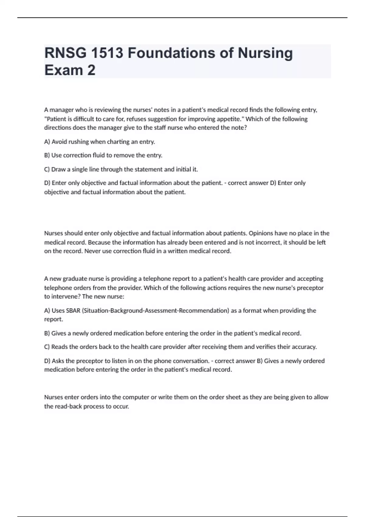 RNSG 1513 Foundations of Nursing Exam 2 Questions with complete solution RNSG 1513 Foundations of Nursing Exam 2 A manager who is reviewing the nurses' notes in a patient's medical record finds the following entry, "Patient is difficult to care for, refuses suggestion for improving appetite." Which of the following directions does the manager give to the staff nurse who entered the note? A) Avoid rushing when charting an entry. B) Use correction fluid to remove the entry. C) Draw a single line through the statement and initial it. D) Enter only objective and factual information about the patient. - correct answer D) Enter only objective and factual information about the patient. Nurses should enter only objective and factual information about patients. Opinions have no place in the medical record. Because the information has already been entered and is not incorrect, it should be left on the record. Never use correction fluid in a written medical record. A new graduate nurse is providing a telephone report to a patient's health care provider and accepting telephone orders from the provider. Which of the following actions requires the new nurse's preceptor to intervene? The new nurse: A) Uses SBAR (Situation-Background-Assessment-Recommendation) as a format when providing the report. B) Gives a newly ordered medication before entering the order in the patient's medical record. C) Reads the orders back to the health care provider after receiving them and verifies their accuracy. D) Asks the preceptor to listen