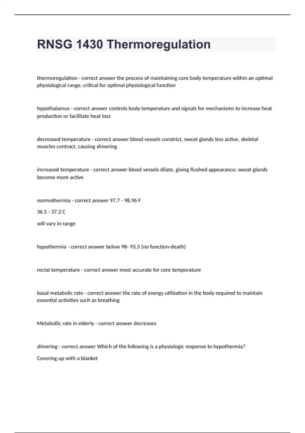 RNSG 1430 Thermoregulation Question and answers rated A+ RNSG 1430 Thermoregulation thermoregulation - correct answer the process of maintaining core body temperature within an optimal physiological range. critical for optimal physiological function hypothalamus - correct answer controls body temperature and signals for mechanisms to increase heat production or facilitate heat loss decreased temperature - correct answer blood vessels constrict, sweat glands less active, skeletal muscles contract, causing shivering increased temperature - correct answer blood vessels dilate, giving flushed appearance; sweat glands become more active normothermia - correct answer 97.7 - 98.96 F 36.5 - 37.2 C will vary in range hypothermia - correct answer below 98- 93.3 (no function-death) rectal temperature - correct a