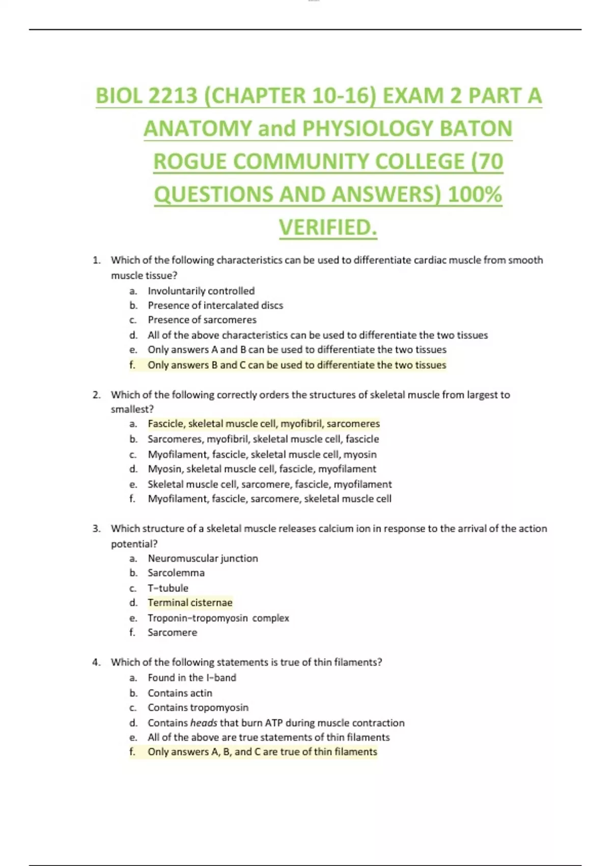 BIOL 2213 (CHAPTER 10-16) EXAM 2 PART A ANATOMY and PHYSIOLOGY BATON ROGUE COMMUNITY COLLEGE (70 QUESTIONS AND ANSWERS) 100% VERIFIED.