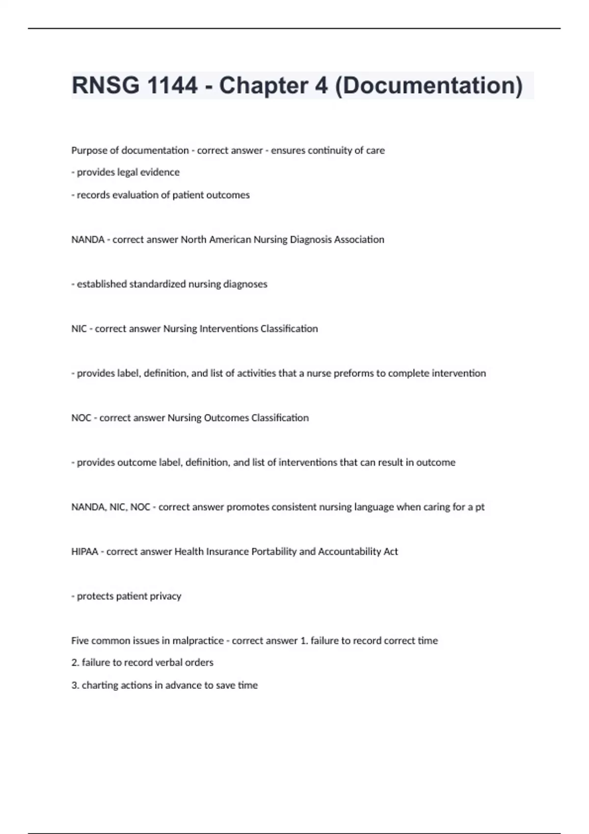 RNSG 1144 - Chapter 4 (Documentation) Question and answers already passed RNSG 1144 - Chapter 4 (Documentation) Purpose of documentation - correct answer - ensures continuity of care - provides legal evidence - records evaluation of patient outcomes NANDA - correct answer North American Nursing Diagnosis Association - established standardized nursing diagnoses NIC - correct answer Nursing Interventions Classification - provides label, definition, and list of activities that a nurse preforms to complete intervention NOC - correct answer Nursing Outcomes Classification - provides outcome label, definition, and list of interventions that can result in outcome NANDA, NIC, NOC - correct answer promotes consistent nursing language when caring for a pt HIPAA - correct answer Health Insurance Portability and Accountability Act - protects patient privacy Five common issues in m