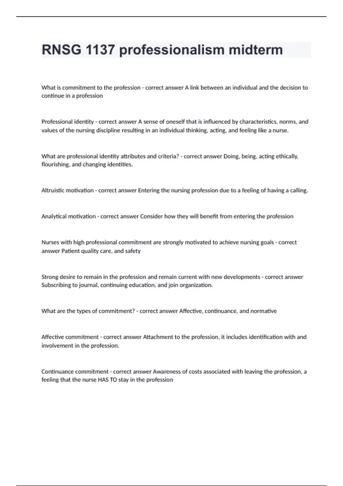 RNSG 1137 professionalism midterm Question and answers already passed RNSG 1137 professionalism midterm What is commitment to the profession - correct answer A link between an individual and the decision to continue in a profession Professional identity - correct answer A sense of oneself that is influenced by characteristics, norms, and values of the nursing discipline resulting in an individual thinking, acting, and feeling like a nurse. What are professional identity attributes and criteria? - correct answer Doing, being, acting ethically, flourishing, and changing identities. Altruistic motivation - correct answer Entering the nursing profession due to a feeling of having a calling. Analytical motivation - correct answer Consider how they will benefit from entering the profession Nurses with high professional commitment are strongly motivated to achieve nursing goals - correct answer Patient quality care, and safety Strong desire to remain in the profession and remain current with new developments - correct answer Subscribing to journal, continuing education, and join organization.
