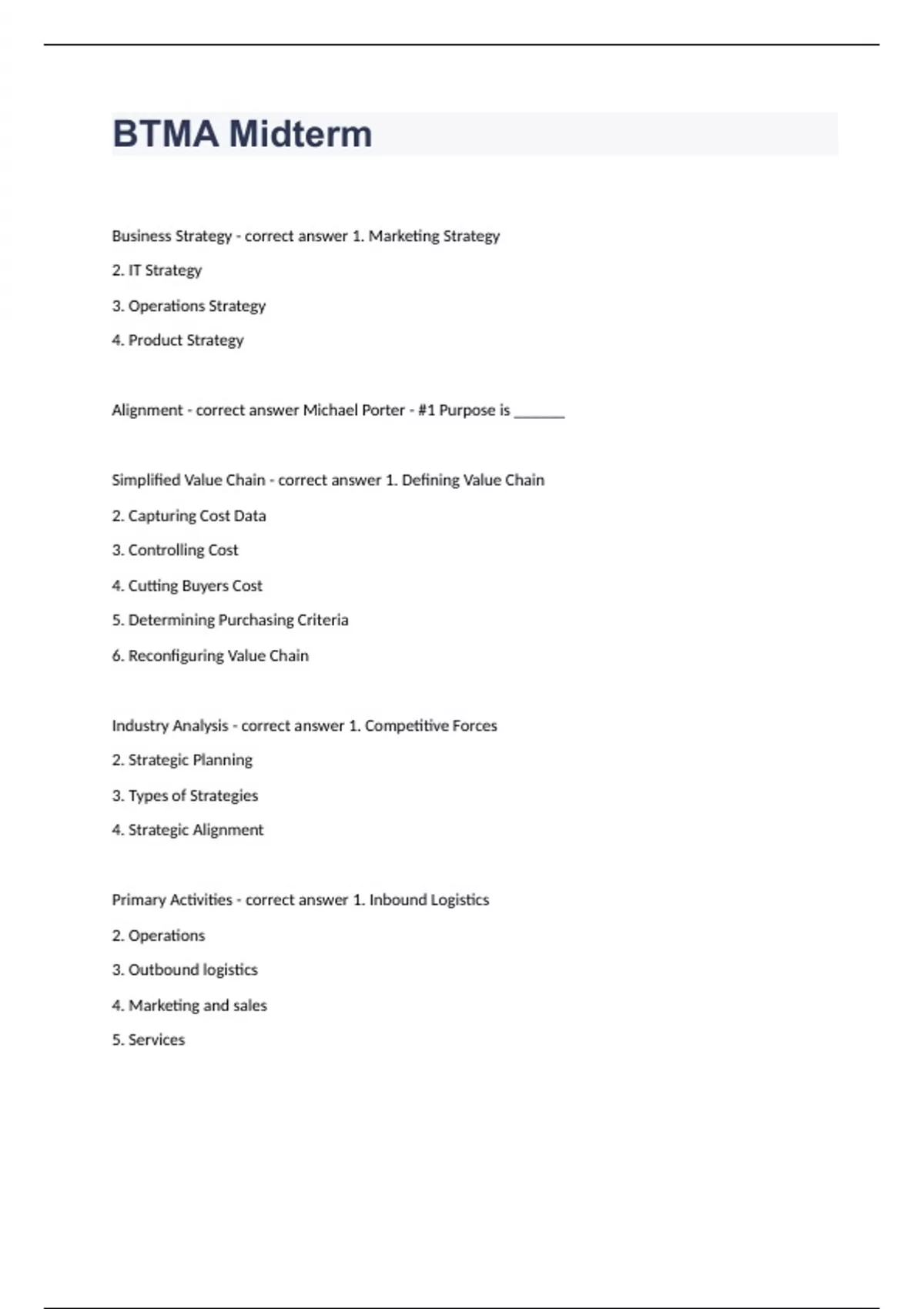 BTMA Midterm Prep Questions Correctly Answered. Business Strategy - correct answer 1. Marketing Strategy 2. IT Strategy 3. Operations Strategy 4. Product Strategy Alignment - correct answer Michael Porter - #1 Purpose is ______ Simplified Value Chain - correct answer 1. Defining Value Chain 2. Capturing Cost Data 3. Controlling Cost 4. Cutting Buyers Cost 5. Determining Purchasing Criteria 6. Reconfiguring Value Chain Industry Analysis - correct answer 1. Competitive Forces 2. Strategic Planning 3. Types of Strategies 4. Strategic Alignment Primary Activities - correct answer 1. Inbound Logistics 2. Operations 3. Outbound logistics 4. Marketing and sales 5. Services Support Activities - correct answer 1. Infrastructure 2. Human resource management 3. Technology Development 4. Procurement Porters Five Forces - correct answer 1. Threat of New Entrants (how easily can competitors enter the market) 2. Threat of Substitutes (How easily can the product be replicated to meet the same customer needs) 3. Bargaining Power of Buyers (how easily can customers influence price of the product or service) 4. Bargaining Power of Suppliers (how easily can suppliers sell their goods at high prices) 5. Rivalry among Existing Competitors (how fierce is the battle for position and how aggressive is competition in the industry) Buyer power high when: - correct answer buyers have many choices Supplier power high when: - correct answer buyers have few choices Threat of substitutes is high when: - correct answer there are many alternatives Threat of New Entrants is high when: - correct answer barriers to entry are low Rivalry is high when: - correct answer competition is fierce Entry Barrier - correct answer -economies of scales -proprietary product differences -brand identity -switching costs -capital requirements -access to distribution
