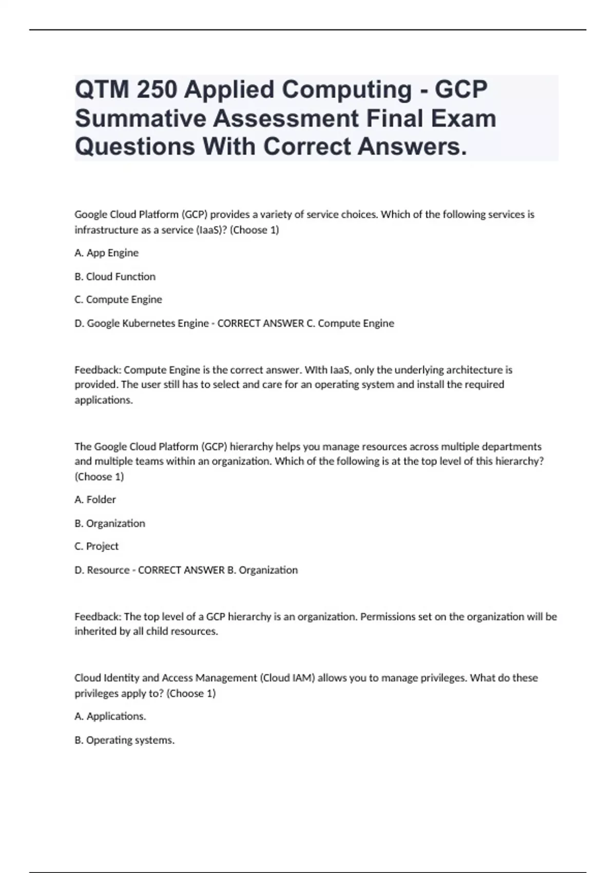 QTM 250 Applied Computing - GCP Summative Assessment Final Exam Questions With Correct Answers. Google Cloud Platform (GCP) provides a variety of service choices. Which of the following services is infrastructure as a service (IaaS)? (Choose 1) A. App Engine B. Cloud Function C. Compute Engine D. Google Kubernetes Engine - CORRECT ANSWER C. Compute Engine Feedback: Compute Engine is the correct answer. WIth IaaS, only the underlying architecture is provided. The user still has to select and care for an operating system and install the required applications. The Google Cloud Platform (GCP) hierarchy helps you manage resources across multiple departments and multiple teams within an organization. Which of the following is at the top level of this hierarchy? (Choose 1) A. Folder B. Organization C. Project D. Resource - CORRECT ANSWER B. Organization Feedback: The top level of a GCP hierarchy is an organization. Permissions set on the organization will be inherited by all child resources. Cloud Identity and Access Management (Cloud IAM) allows you to manage privileges. What do these privileges apply to? (Choose 1) A. Applications. B. Operating systems. C. Google Cloud Platform (GCP) resources. D. Applications, GCP, and operating systems. - CORRECT ANSWER C. Google Cloud resources. Feedback: IAM only applies to the GCP resources you use. Application and operating system security must be handled separately. Projects form part of the Google Cloud Platform (GCP) resources hierarchy. Which of the following is true concerning projects? (Choose 1) A. Projects are only used for billing. B. You can nest projects inside projects. C. Projects are allocated a changeable Project ID. D. All resources must be associated with a project. - CORRECT ANSWER D. All resources must be associated with a project. Feedback: The GCP resources you use, no matter where they reside, must belong to a project. Google Cloud provides resources in multi-regions, regions, and zones. What best describes a zone? (Choose 1) A. An edge location. B. One or more data centers. C. A point of presence (PoP). D. Geographic location to leverage services. - CORRECT ANSWER B. One or more data centers. Feedback: Regions are made up of zones. Each Region will have at least 3 data centers or zones to provide high availability. What type of service best describes Google Kubernetes Engine? (Choose 1) A. Hybrid B. IaaS C. PaaS