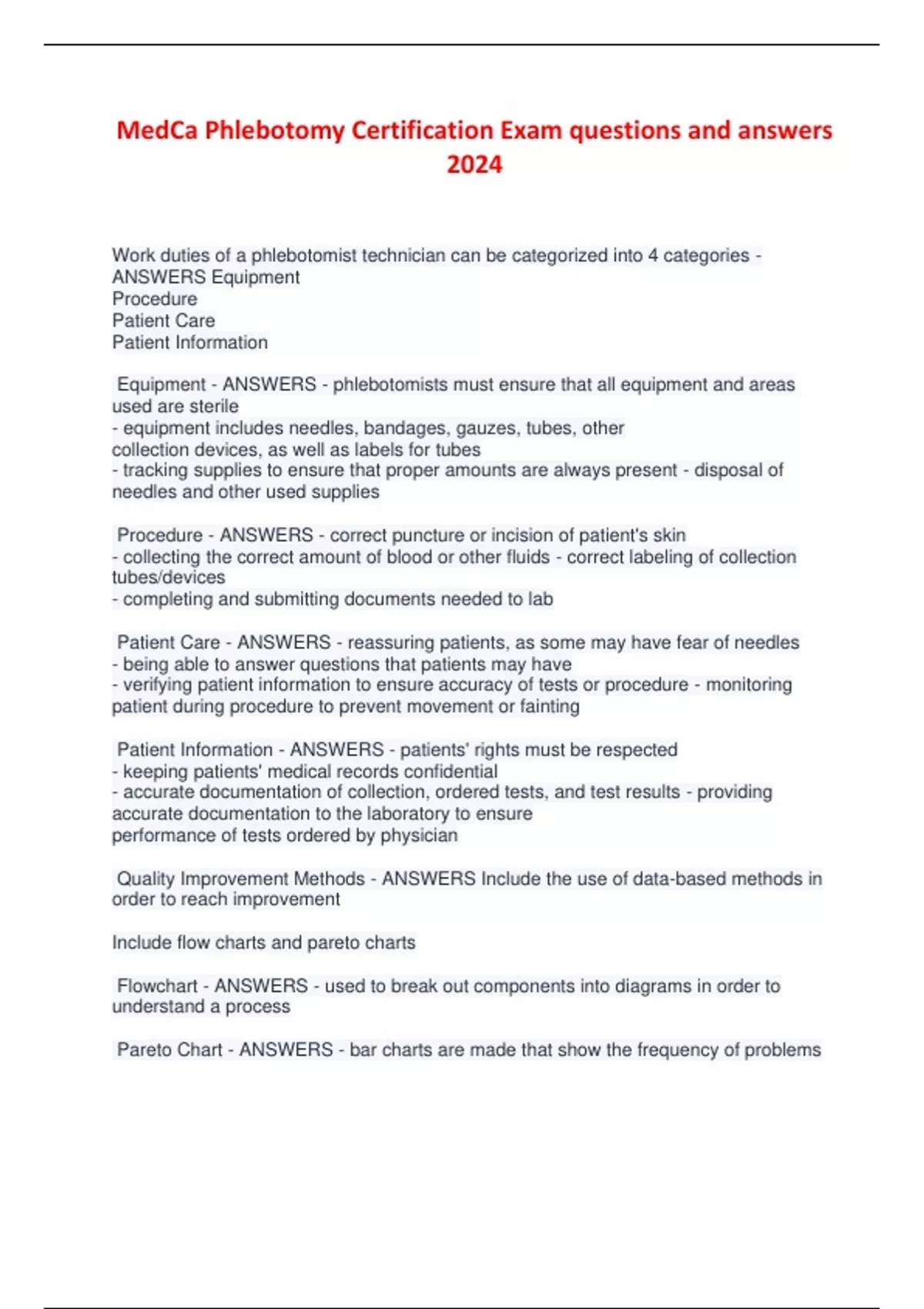 MedCa Phlebotomy Certification Exam questions and answers 2024 Work duties of a phlebotomist technician can be categorized into 4 categories - ANSWERS Equipment Procedure Patient Care Patient Information Equipment - ANSWERS - phlebotomists must ensure that all equipment and areas used are sterile - equipment includes needles, bandages, gauzes, tubes, other collection devices, as well as labels for tubes - tracking supplies to ensure that proper amounts are always present - disposal of needles and other used supplies Procedure - ANSWERS - correct puncture or incision of patient's skin - collecting the correct amount of blood or other fluids - correct labeling of collection tubes/devices - completing and submitting documents needed to lab Patient Care - ANSWERS - reassuring patients, as some may have fear of needles - being able to answer questions that patients may have - verifying patient information to ensure accuracy of tests or procedure - monitoring patient during procedure to prevent movement or fainting Patient Information - ANSWERS - patients' rights must be respected - keeping patients' medical records confidential - accurate documentation of collection, ordered tests, and test results - providing accurate documentation to the laboratory to ensure performance of tests ordered by physician Quality Improvement Methods - ANSWERS Include the use of data-based methods in order to reach improvement Include flow charts and pareto charts Flowchart - ANSWERS - used to break out components into diagrams in order to understand a process Pareto Chart - ANSWERS - bar charts are made that show the frequency of problems What does quality improvement for specimen collection involve? - ANSWERS Technique of Phlebotomist Frequency of hematoma Recollection Rates What is included in quality control records - ANSWERS Expiration Date Stability Information Storage Information Proper Use Precision of testing supplies/reagents Accuracy of testing supplies/reagents Where can phlebotomists work? - ANSWERS Hospital Clinic Doctor's office Laboratories Blood Banks Research Firms Pharmaceutical Firms Hospital - ANSWERS institution which provides medical and surgical treatment Clinic - ANSWERS institution or hospital department focusing on diagnosis and care of outpatients Doctor's Office - ANSWERS suite/office where doctors receive and treat patients Laboratory - ANSWERS building or room where tests are performed to evaluate specimens in order to diagnose medical conditions Blood Bank - ANSWERS institution where blood is collected from donors, and then stored and prepared for transfusion Research Firm - ANSWERS institution equipped for scientific/medical research that may specialize in basic research or on specific areas Pharmaceutical Firm - ANSWERS institution that develops and markets drugs for use as medications How must all needles be discarded? - ANSWERS intact What does it mean if an infection is classified as nosocomical - ANSWERS A patient developed the infection while they were in the hospital that was not present before entering the hospital What is included in the chain of infection - ANSWERS source susceptible host poor isolation technique Hygiene - ANSWERS wash hands with soap and water if they are visibly dirty good hand-hygiene techniques reduce number of outbreaks of infections hand washing is the single most important way to prevent spread of infection Equipment used to control infections - ANSWERS gloves, masks, goggles, gowns, or coats autoclaves (instruments for sterilizing under pressure) Emergency Needle Stick Information - ANSWERS if exposed to blood due to a needle stick or other sharp object, wash needle stick and cut with soap and water flush mouth, eyes, and skin with water report the incident to a superviso