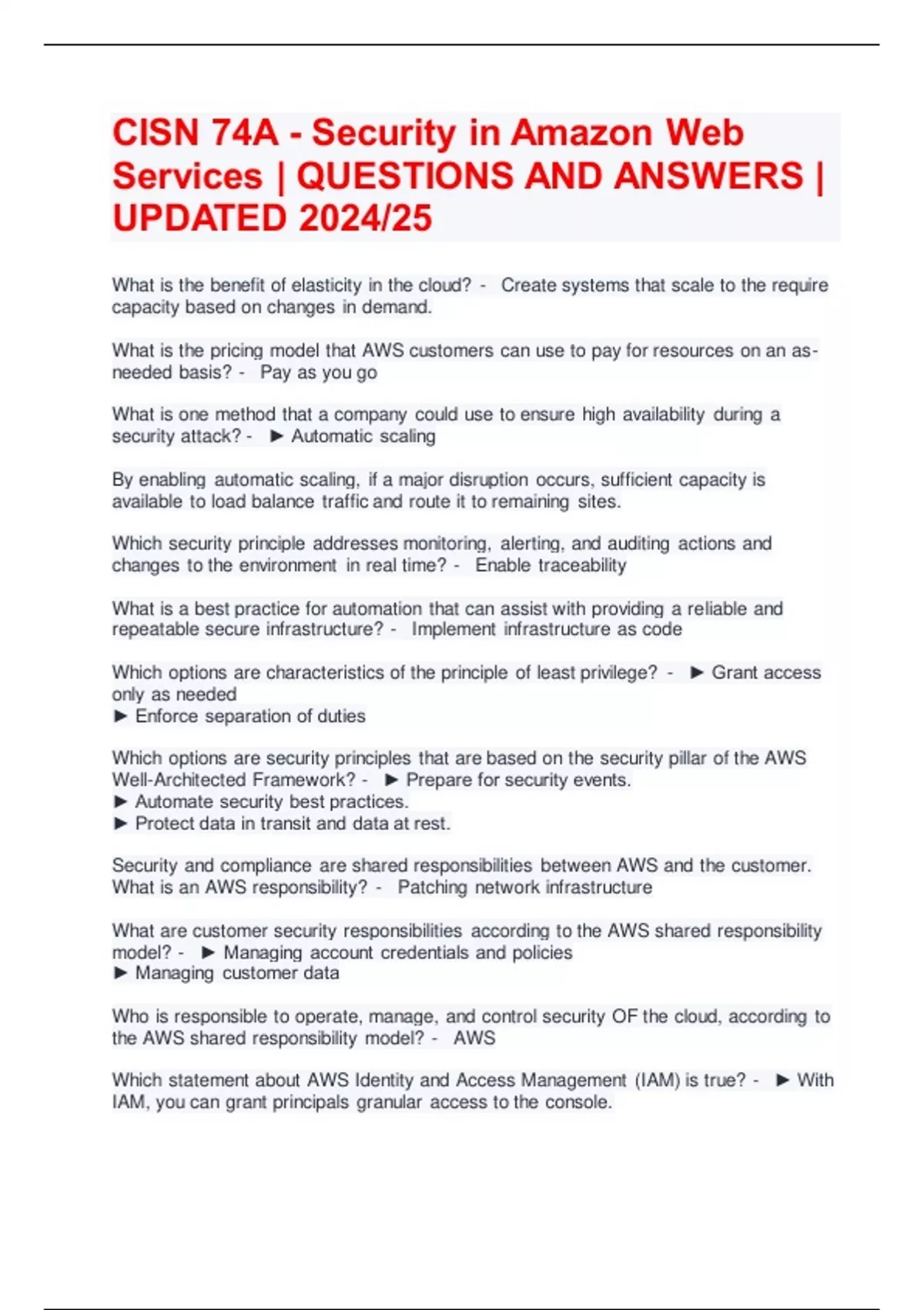 CISN 74A - Security in Amazon Web Services | QUESTIONS AND ANSWERS | UPDATED 2024/25