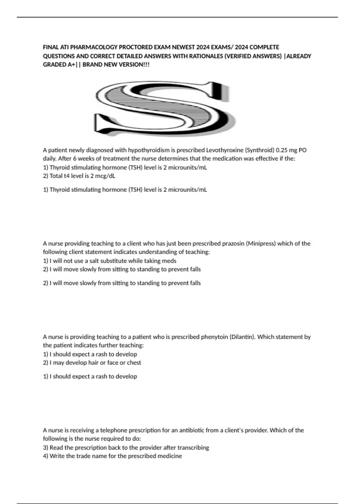 FINAL ATI PHARMACOLOGY PROCTORED EXAM NEWEST 2024 EXAMS/ 2024 COMPLETE QUESTIONS AND CORRECT DETAILED ANSWERS WITH RATIONALES (VERIFIED ANSWERS) |ALREADY GRADED A+|| BRAND NEW VERSION!!!